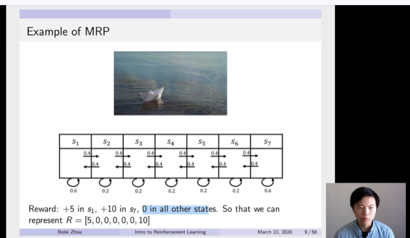 这里马尔可夫奖励过程,你其实可以把它看成一个纸船,就是当我们把一个纸船放到一个河流之中去,那么它就会随着这个河流的而流动。然后它自身其实是没有动力的。所以可以把这个马尔可夫奖励过程看成是一个随波逐流的一个领域。当从某一个点开始的时候,这个纸船它就会随着我们事先定义好的状态转移,然后进行流动。然后他到达每个状态过后,就有可能获得一些奖励。