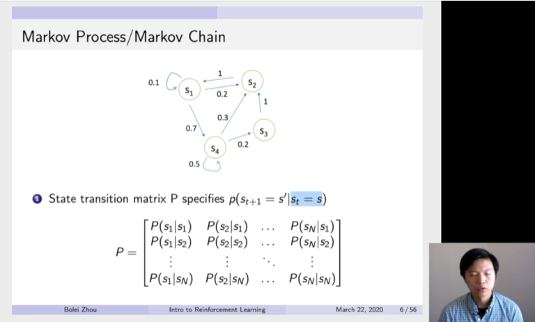 我们首先来看一看马尔科夫链,这里我举了一个简单例子。这幅图里面有四个状态,这四个状态从S1、S2、S3、S4之间互相转移。比如说从这里开始,S1它有0.1的概率继续存活在S1状态,另外它有0.2的概率转移到S2,另外有0.7的概率转移到S4。从0.4如果是当前状态的话,那么它有0.3的概率转移到S2,有0.2的转概率转移到S3有另外有0.5的概率留在这里。所以描述这样的状态转移,我们可以用这一个状态转移矩阵。状态转移矩阵类似于一个conditional probability,就是当我们之前知道当前我们在St这个状态过后,到达下面所有状态的一个概率。所以它每一行其实描述了是从一个节点到达所有其他节点的这个概率。