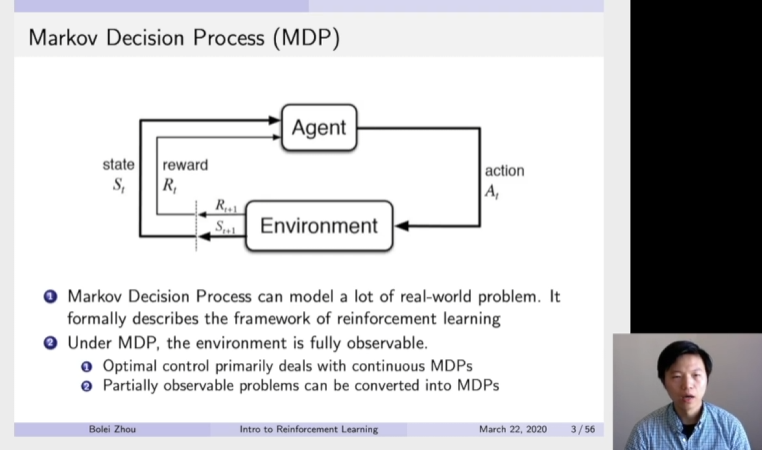 即Agent 跟 环境 一来一回的互动,其实可以用一个叫 MDP(马尔科夫决策过程)的数学模型来描述。