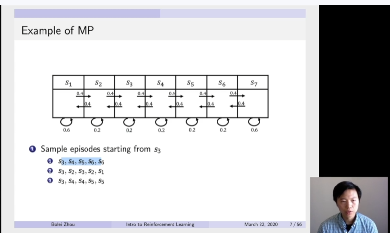 这里是一个马尔科夫链的例子,我们这里有七个状态,状态之间的转移概率我也列在这里了。比如说从S1开始到S2,它有0.4的概率,然后另外它有0.6的概率继续存活在它当前概率从S2,然后它有0.4的概率到左边,另外有0.4的概率到S3,另外有0.2的概率存活在它现在的状态。所以当我们给定了这个状态转移的马尔可夫链过后,我们可以对这个链进行采样,这样就会得到一串的轨迹。下面我们这里有三个轨迹都是从同一个起始点开始的。就假设我们从S3这个状态开始,我们比如说第一条链就是说它先到了S4,然后又到了S5,然后又往右走到了S6,然后继续存活在S6状态。另外第二条链说的是他从S3开始,先往左走到了S2,然后它又往右走又回到了S3,然后它又往左走,然后再往左走到了S1。通过对这个状态的采样,我们就可以生成很多这样的轨迹。