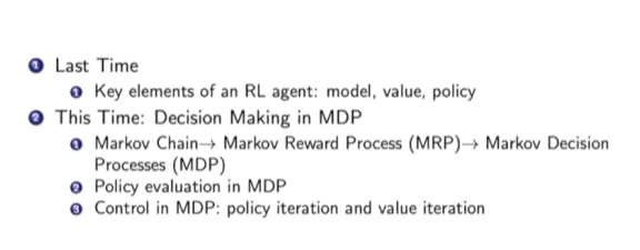 上一节课介绍了强化学习agent的组成成分,它是由model、value policy这三者组成的。第二课会介绍马尔科夫决策过程。