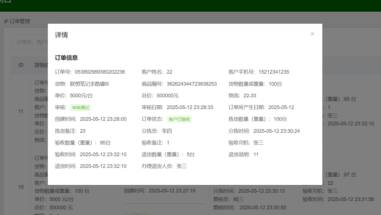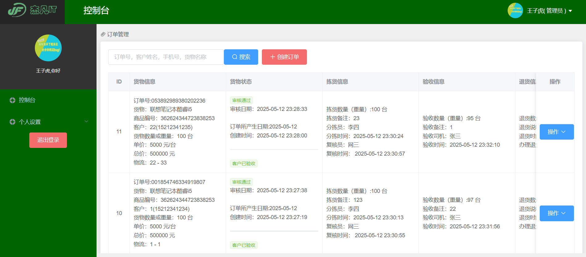- 商品订单管理:负责新增、审核、修改、删除商品订单,并对订单状态进行跟踪(如配货中、待复核、已装车待验收等)。