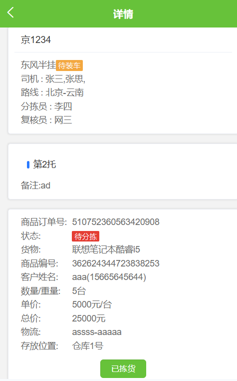 - 任务接收与查看:接收并查看分配给自己的运输单详情,包括货物信息、收发货地址、联系人信息及配送路线。