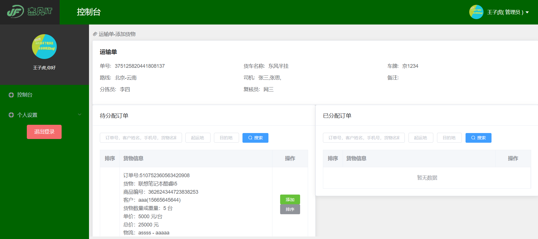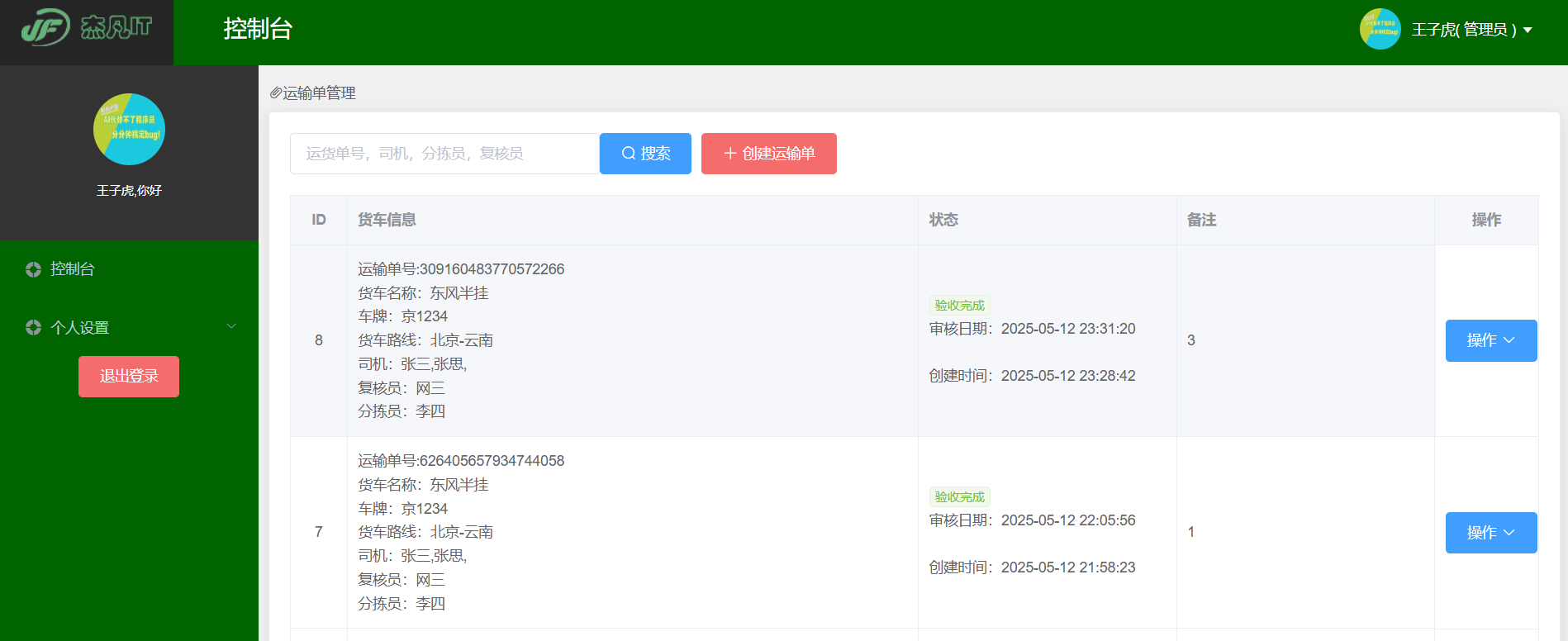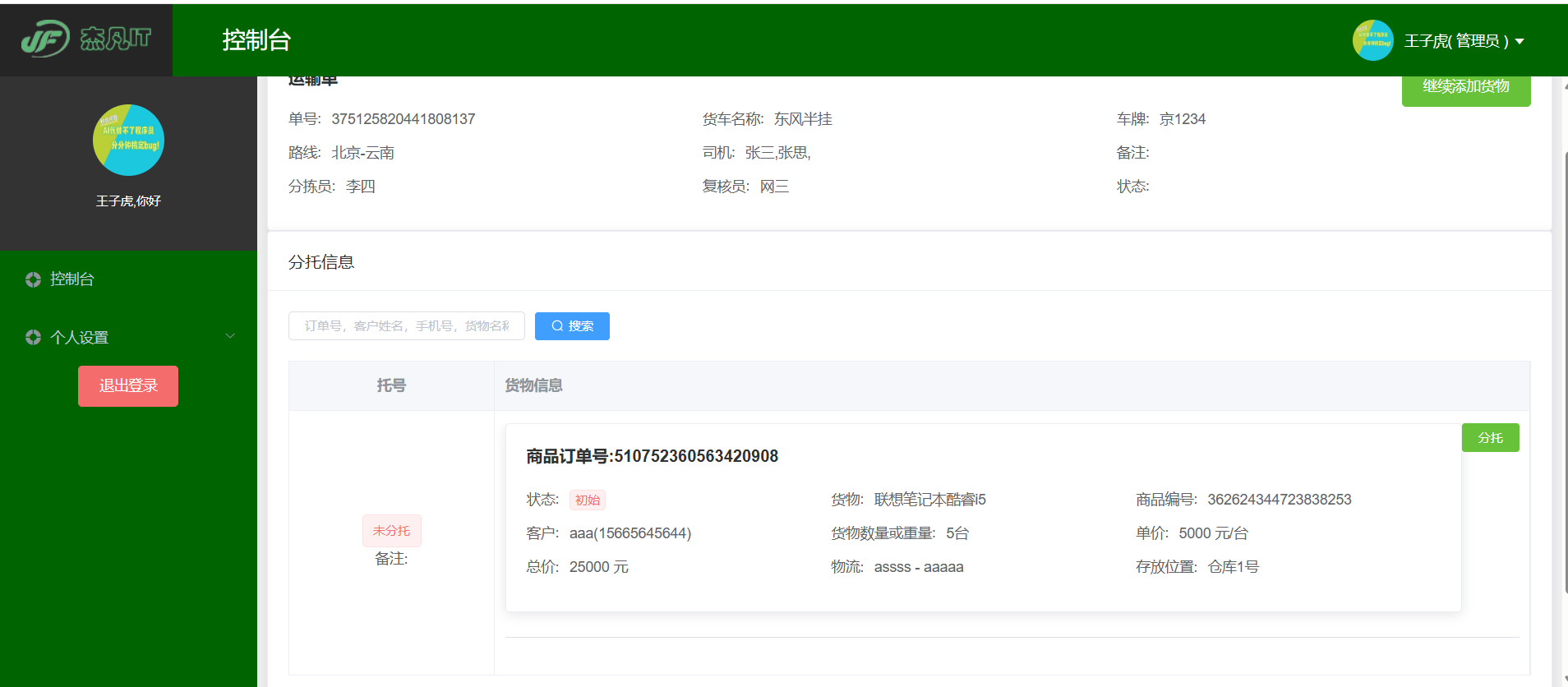 - 运输单管理:将已审核的商品订单生成运输单,进行分托、分配车辆和司机,并对运输状态进行全程跟踪。