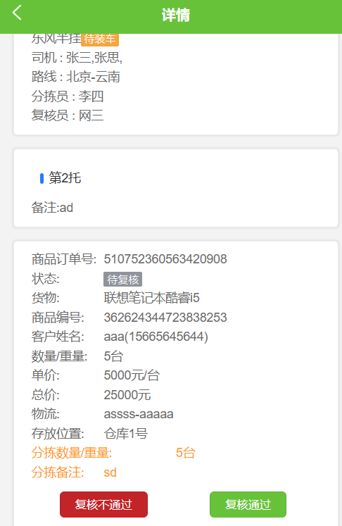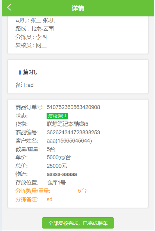 - 执行复核:核对分拣员完成的商品信息和数量,确认无误后更新订单状态,并审核运输单,准备装车。