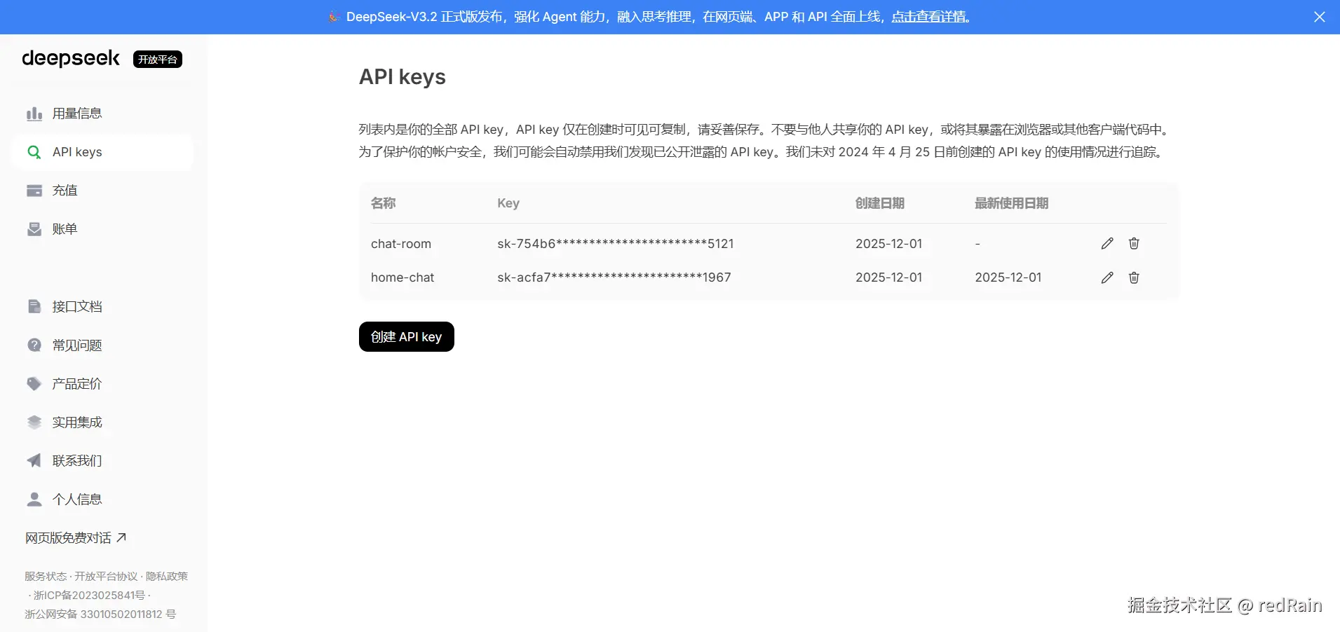- 去DeepSeek买API或者OpenAI买API额度,下图是DeepSeek,支持下国产。创建一个API keys,记得保存key,因为只能创建的时候复制Key。