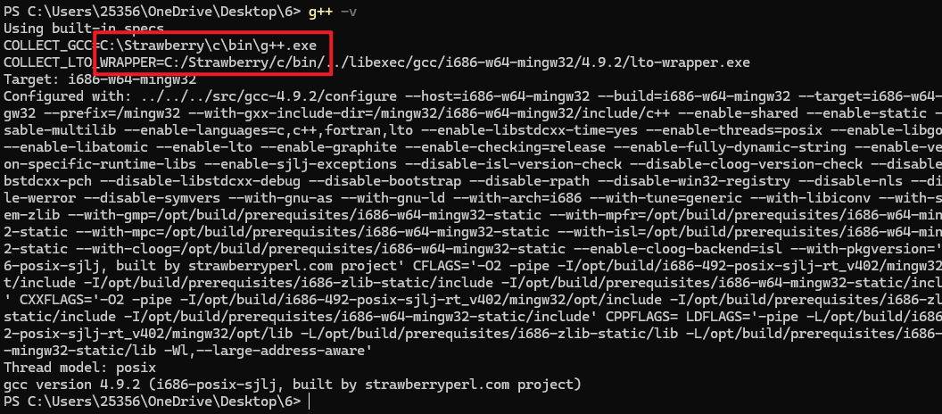 重点来了,当我使用命令g++ -v,看到当前使用的路径是C:/Strawberry/c/bin/