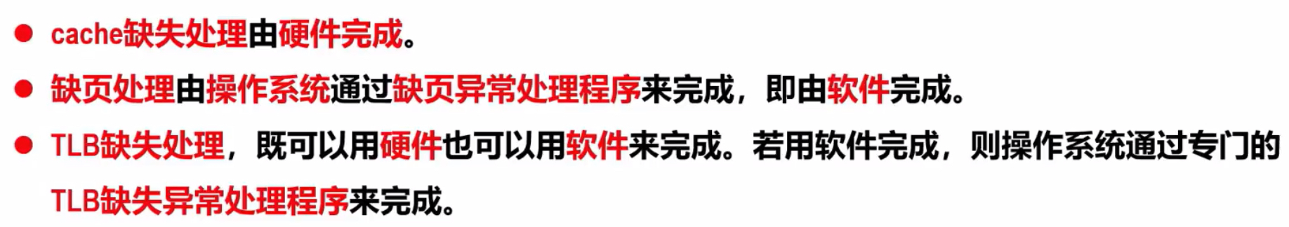 - Cache缺失硬件处理: Cache未命中由处理器自行通过地址转换后访问更低层级存储完成,无需操作系统介入[3]。