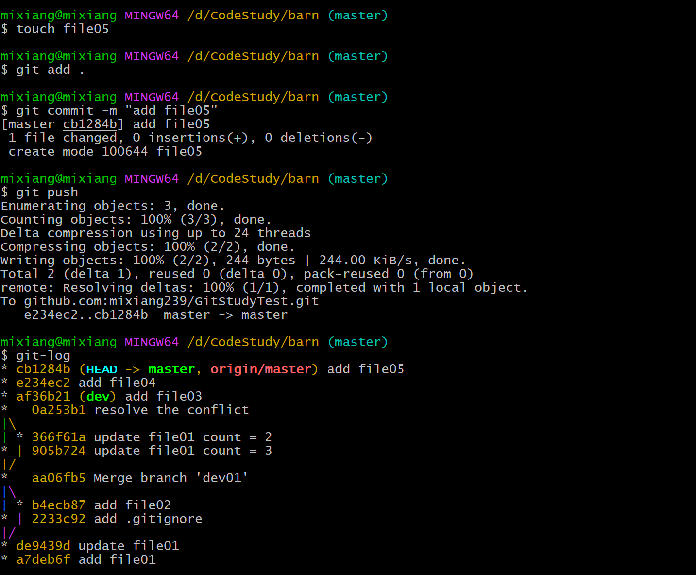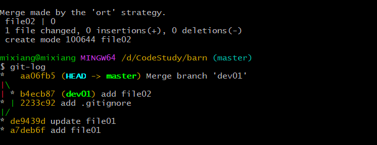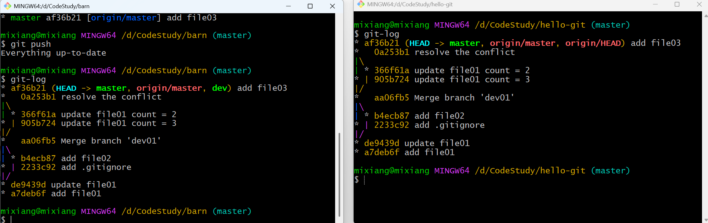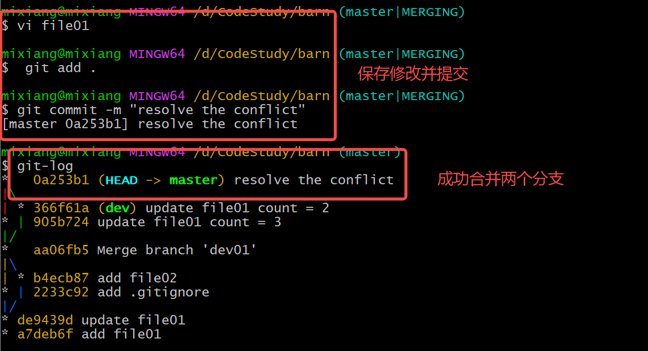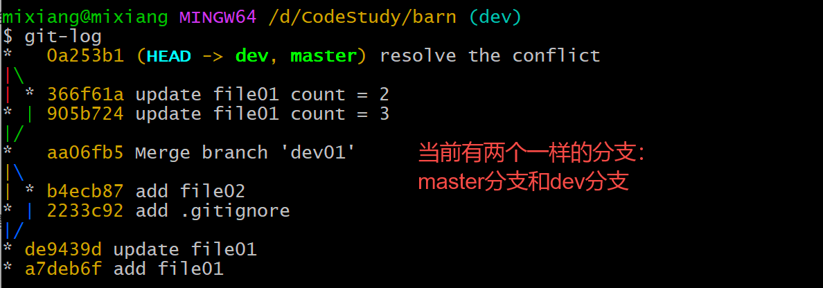 最后输入git-log查看提交记录,发现已经成功处理了冲突,dev分支也已经合并到master分支上。