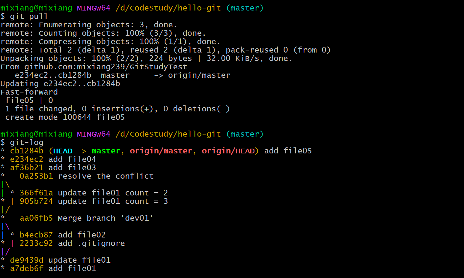 和另一个Git Bash中的日志一样,接下来看看拉取,可以直接抓取并合并。
