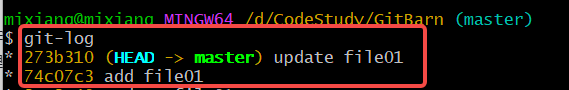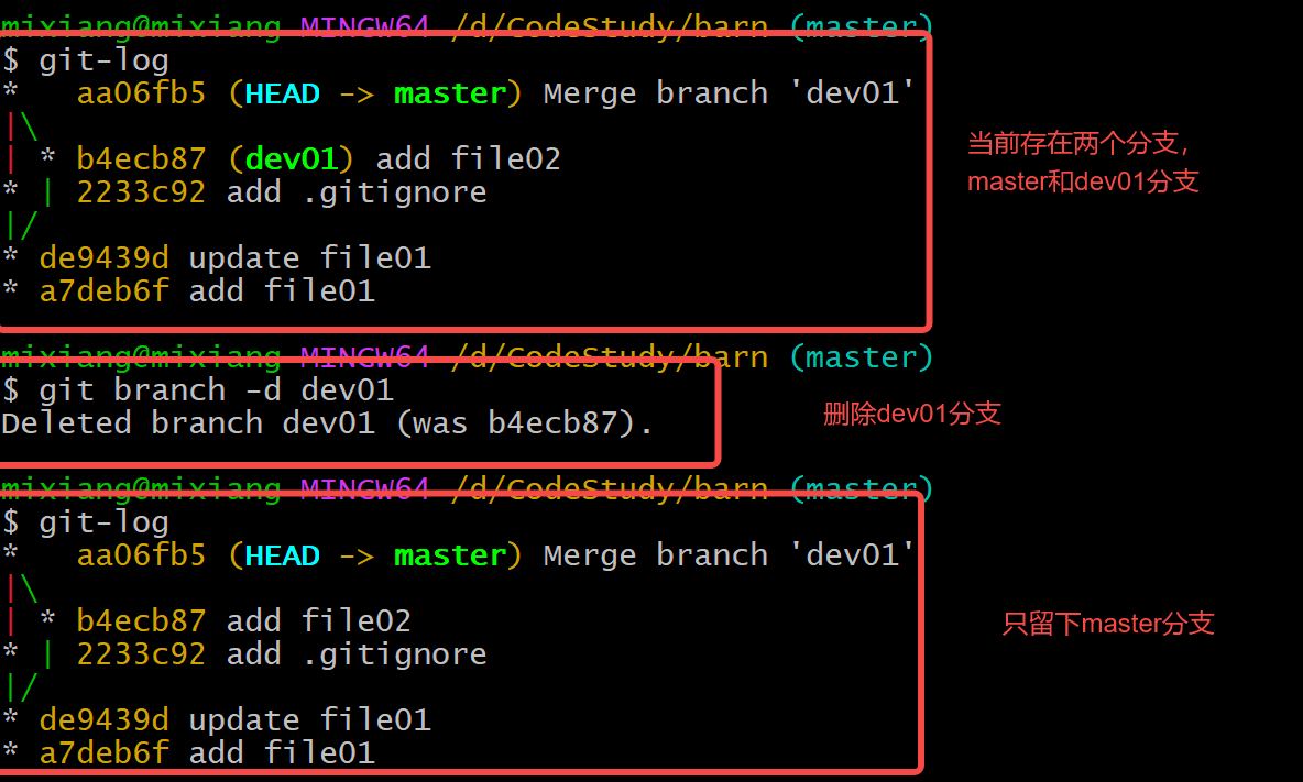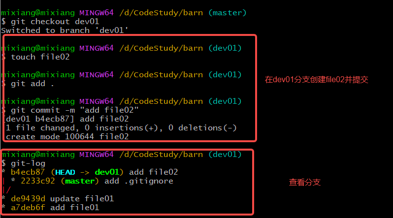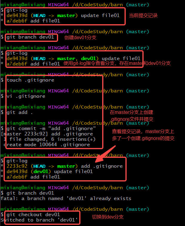 首先输入git-log查看当前分支,日志显示当前存在master分支和dev01分支,由于dev01分支和master分支不是完全相同的,这时我们先删掉dev01分支,随后创建并切换到dev分支上: