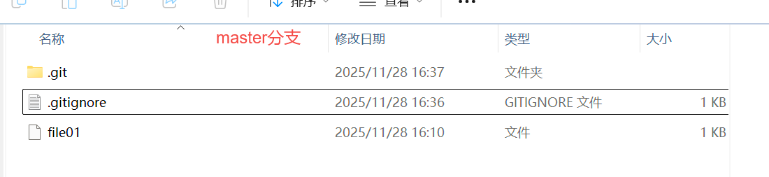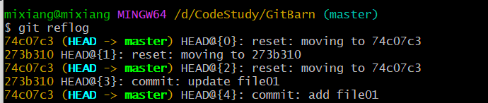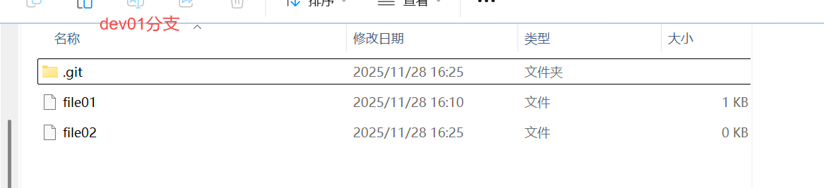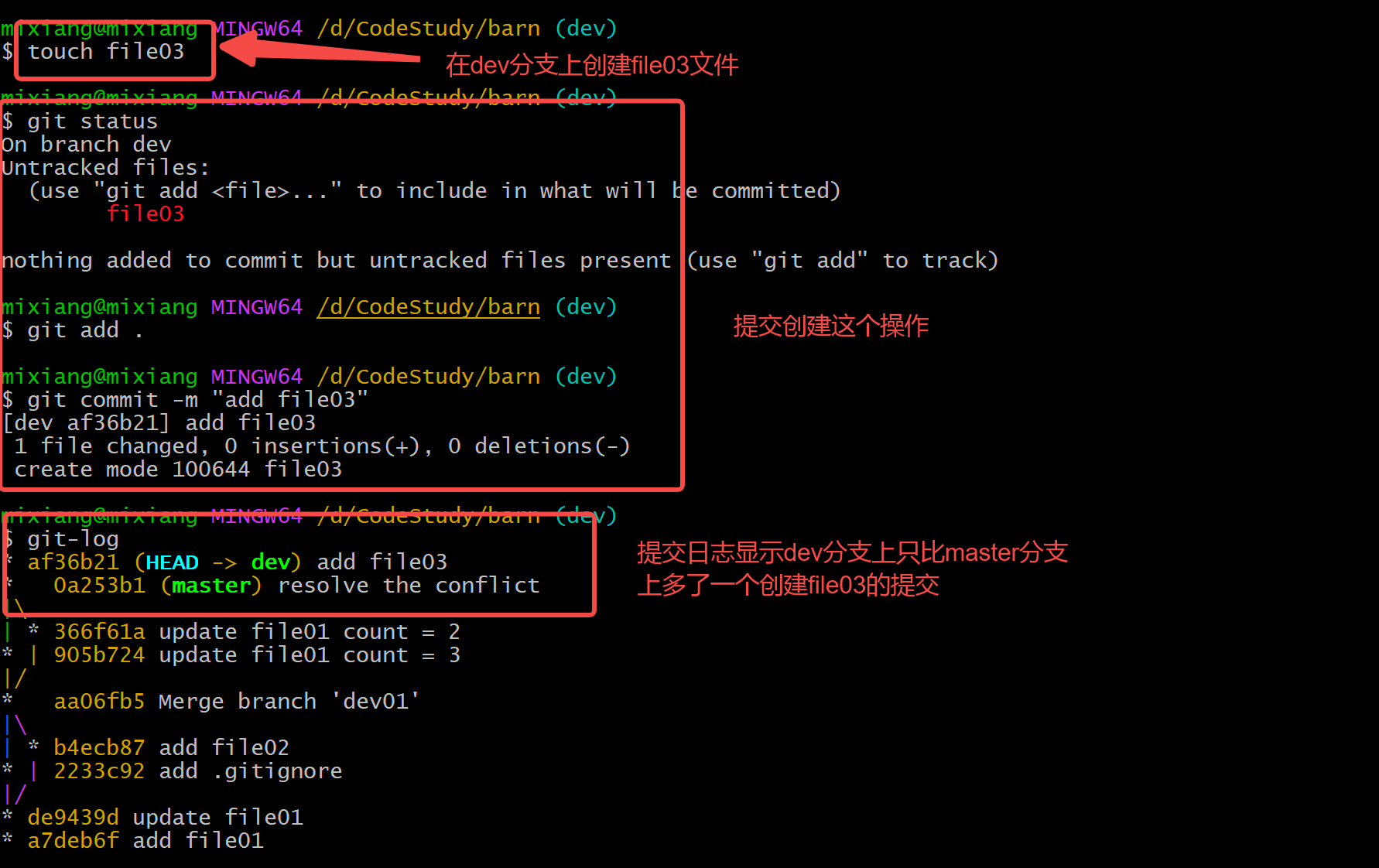 查看当前分支,日志显示当前有两个一模一样的分支:master分支和dev分支。随后我们在dev分支上创建file03文件并提交: