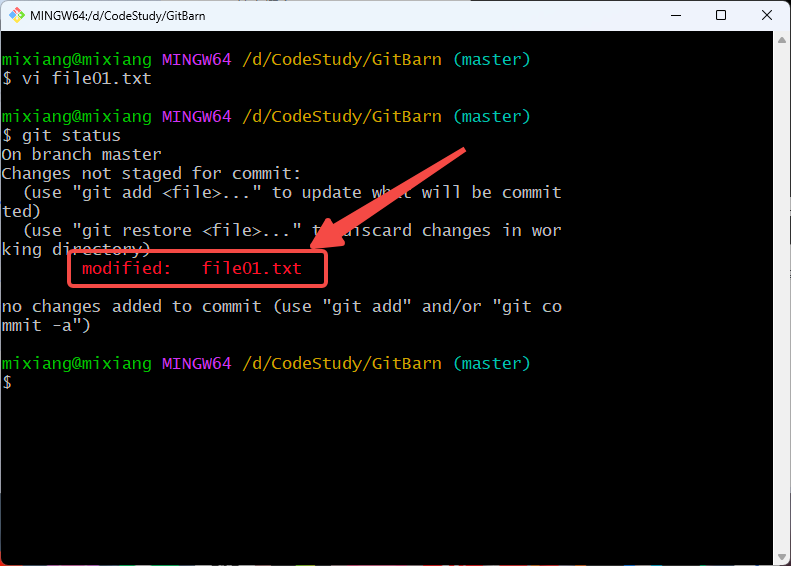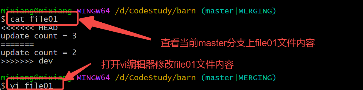 可以看到Git已经帮我们列出冲突产生的位置,并把不同分支上的内容都展示出来,以便我们处理冲突。输入vi file01来修改这个冲突: