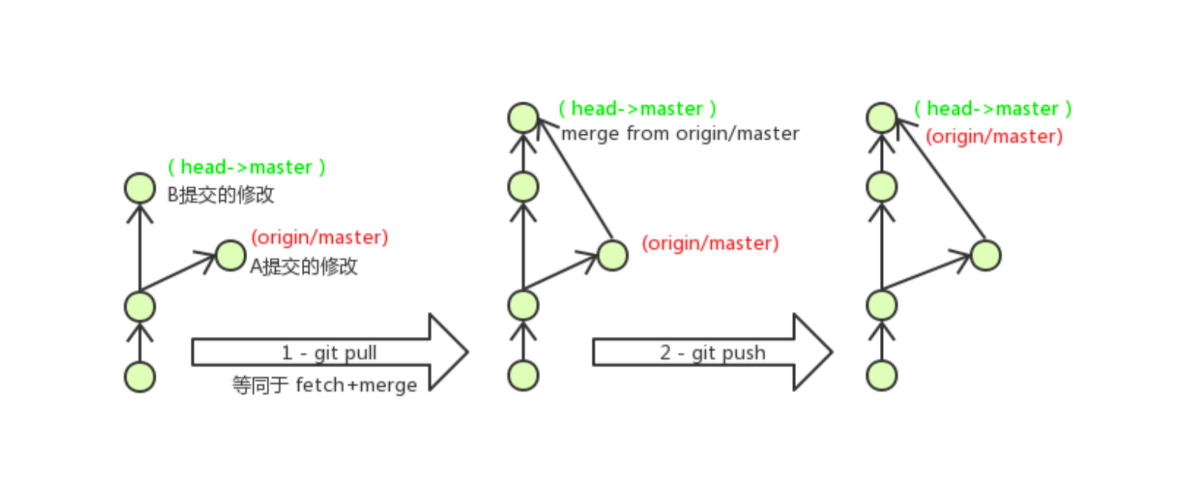 在一段时间,A、B用户修改了同一个文件,且修改了同一行位置的代码,此时会发生合并冲突。 A用户在本地修改代码后优先推送到远程仓库,此时B用户在本地修订代码,提交到本地仓库后,也需要 推送到远程仓库,此时B用户晚于A用户,故需要先拉取远程仓库的提交,经过合并后才能推送到远端分支,如下图所示。