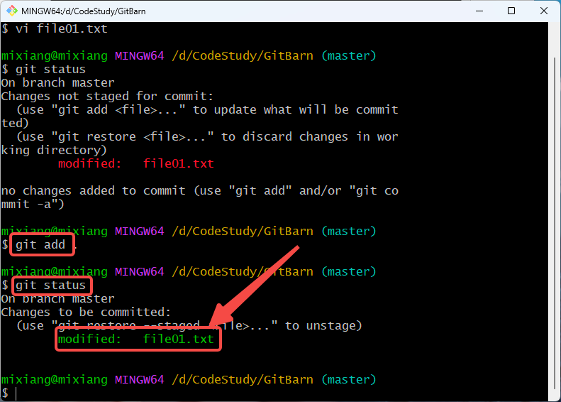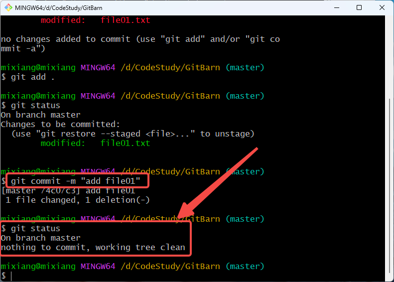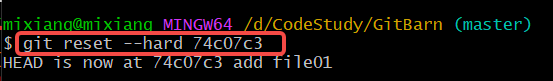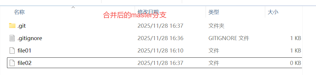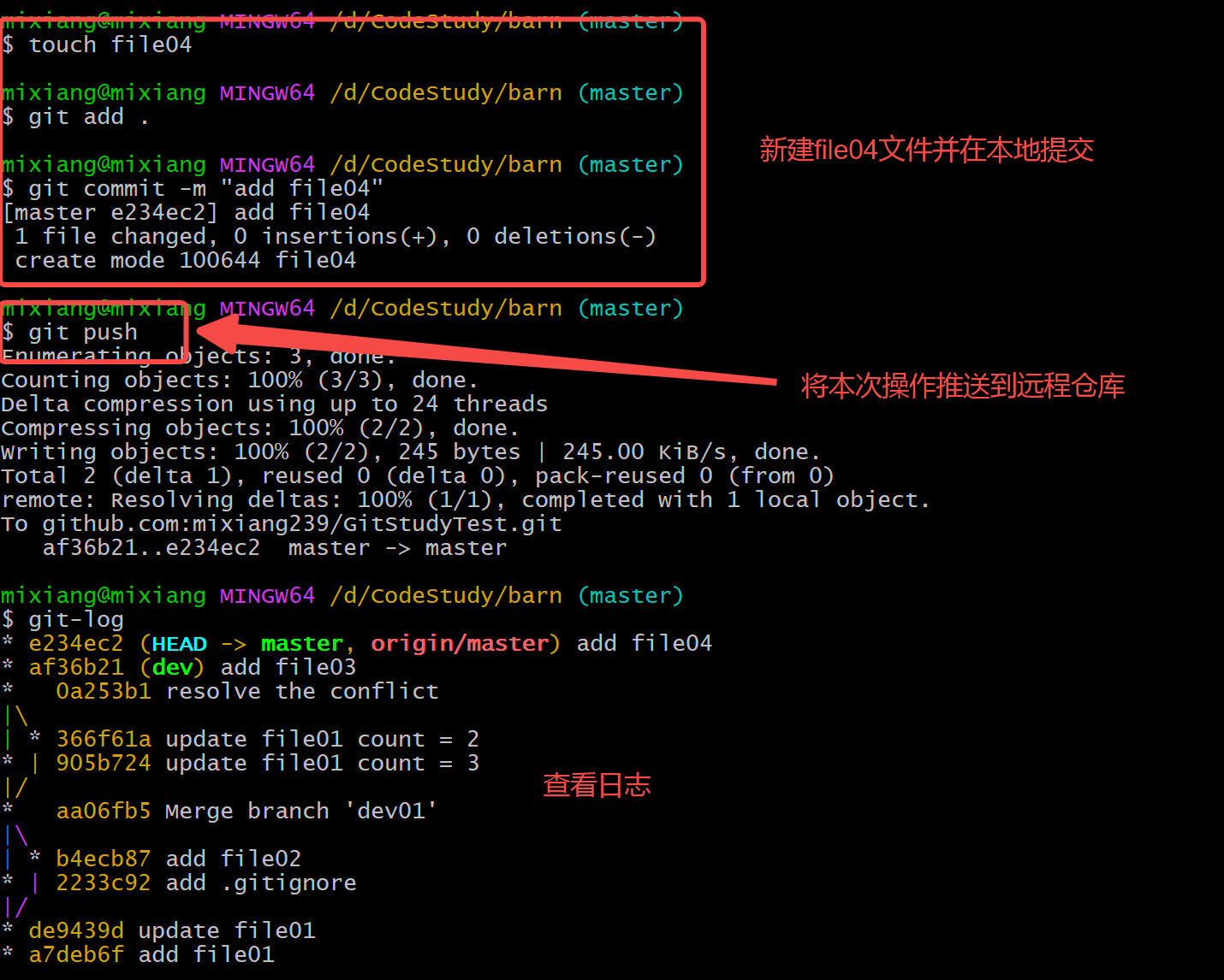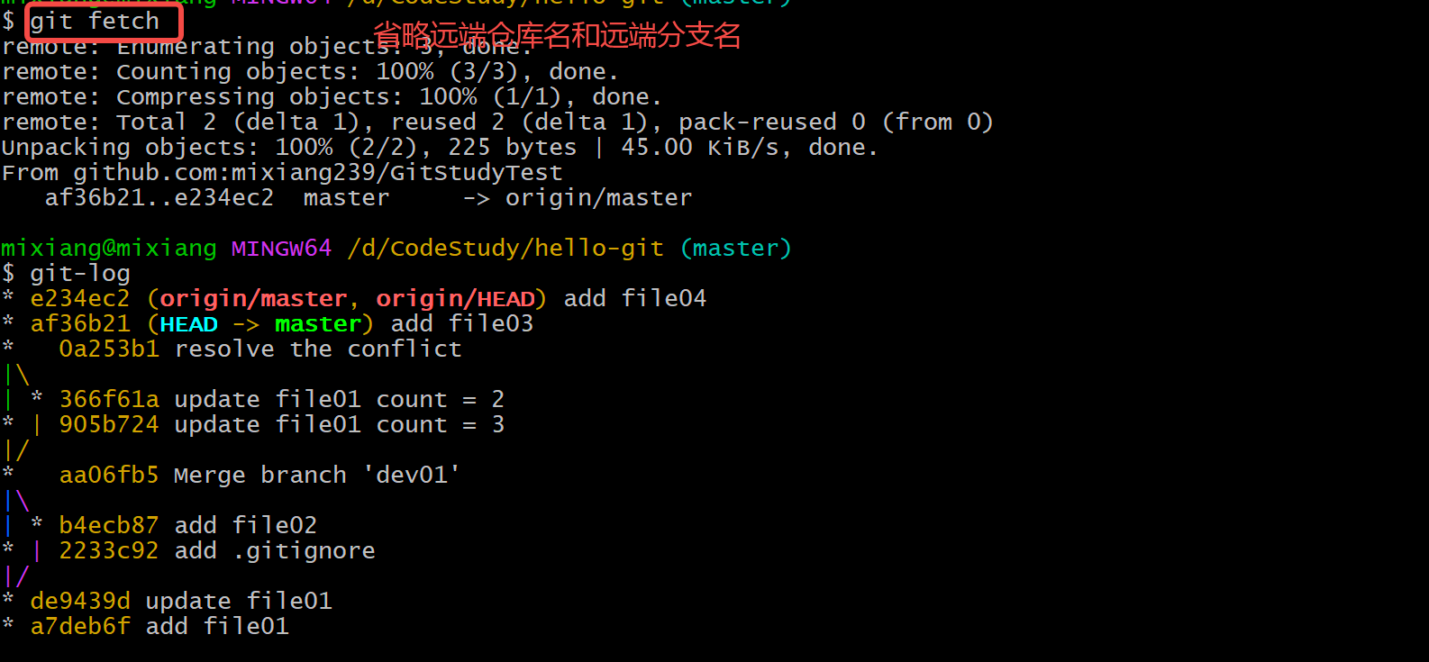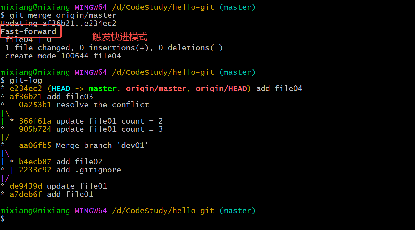 但是当前本地库还处于add file03,本地的master分支中并没有add file04这个提交,说明fetch指令只会拿到更新,并不会把这个更新合并到本地分支。这时我们可以通过merge指令来将远端master分支合并到本地master分支上: