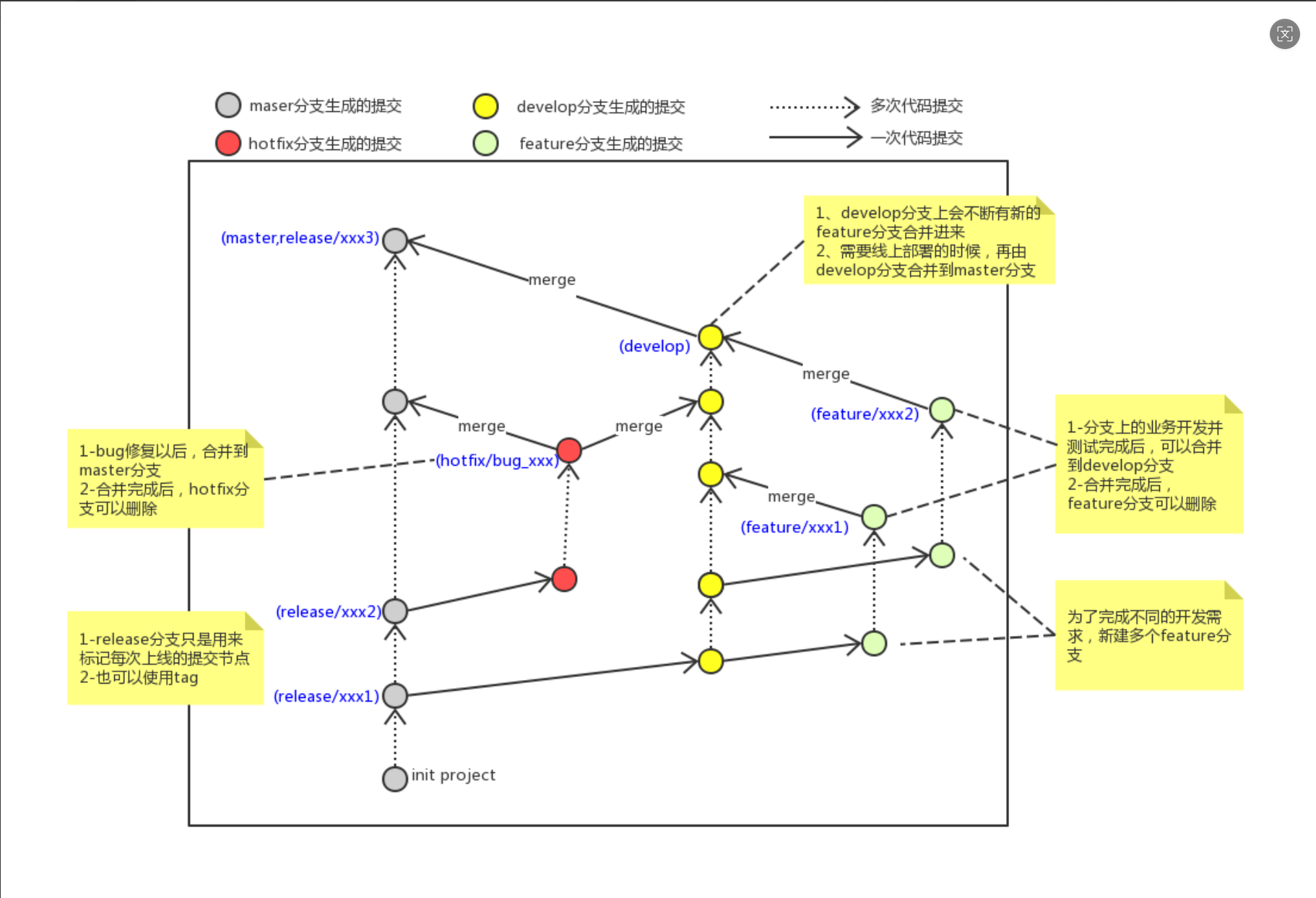 另外,在图中还有hotfix分支,这个分支是用来修复已经发布的版本中产生的bug。比如图中release2版本中用户反馈了一个bug,我们现在要去修复这个bug,可肯定不能在master分支上直接修改,这会影响到所有的用户。这时我们西欧iiu可以在当前版本上创建一个hotfix分支,在这个分支上进行一系列的修改、测试,最终确定bug已经修复后,再合并到master分支上形成下一个ralease版本。随后还要将hotfix分支合并到devdelop分支上,因为如果不合并到develop分支上,后续develop分支新功能开发完毕合并到master分支上时,就会丢失先前修复的提交,所以这里还要合并到develop分支上。