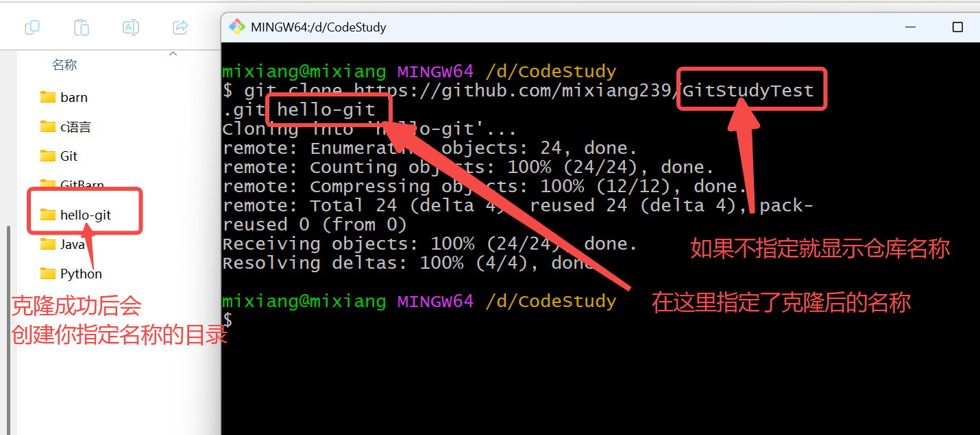 在想要克隆的目录下右键打开Git Bash,输入git clone <仓库路径> <本地名称>,如果不指定目录就会自动新建一个目录,名称就是远程仓库的名称。等待一会就克隆成功了,它和我们本来的本地库和远程仓库的内容都是一模一样的。关掉刚刚克隆仓库的Git Bash,因为这是在hello-git外面打开的Git Bash是操作不了hello-git这个库的,进入hello-git右键打开Git Bash,输入git-log,在刚刚推送的Git Bash中也输入git-log:
