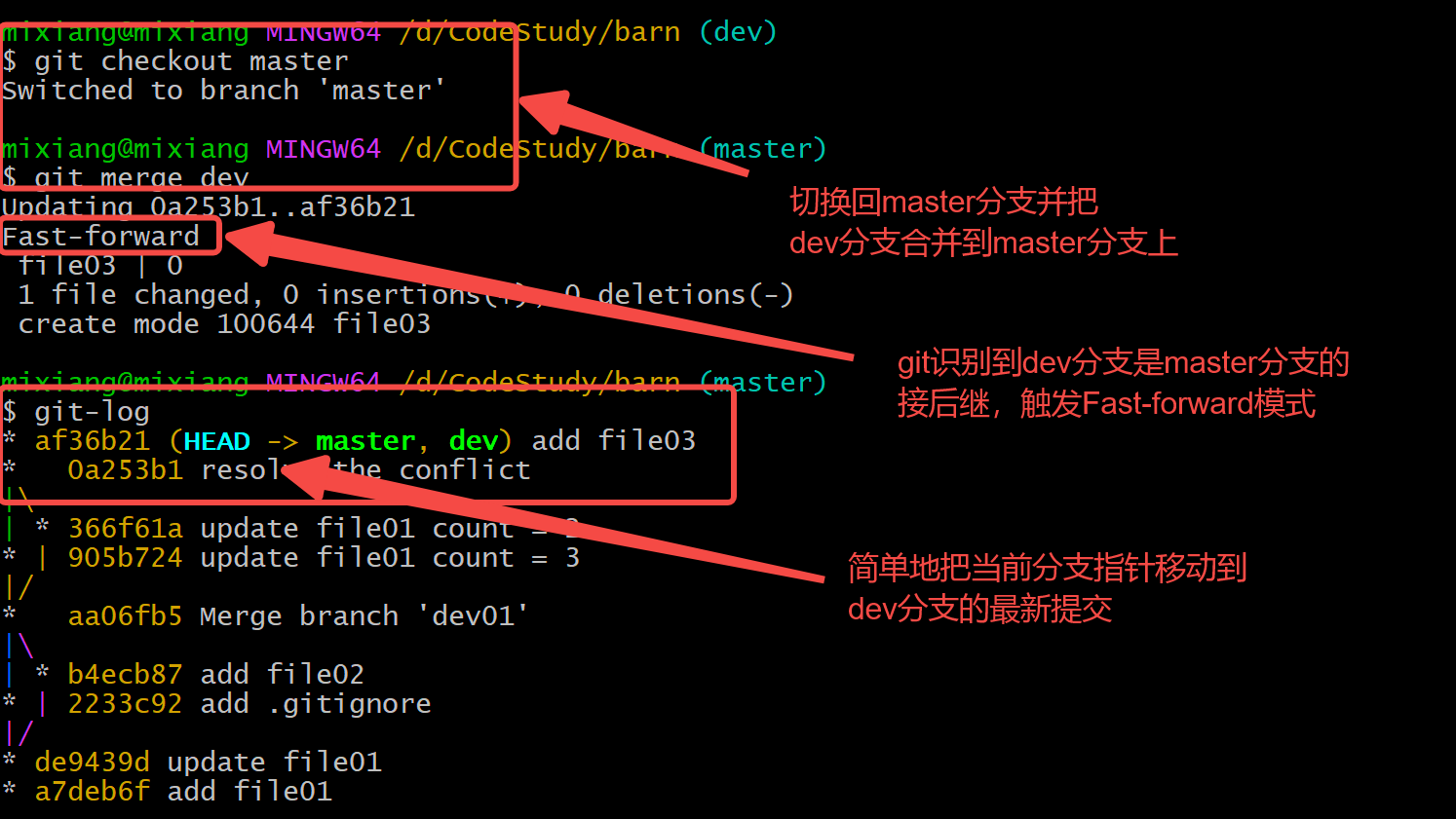Git会自动识别到dev分支上master分支的直接后继,即master分支上有的dev分支也都有,这时合并就不会产生冲突,就会触发Git的快进模式,即Fast-forward模式,Git会简单地把当前分支指针指向dev分支的最新提交,这时master分支也就处于这个地方,而且不会产生以往合并分支时类似于小桥一样的结构。
