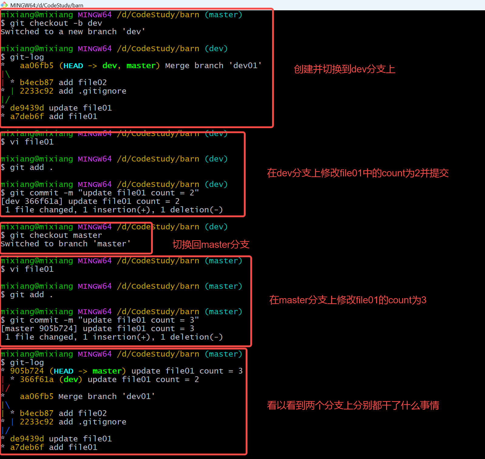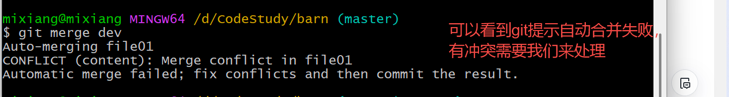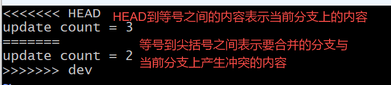 然后分别在dev、master分支上修改feile01文件的count为不同的值,这时就产生了冲突,如果这时我们想要把dev分支合并到master分支上:
