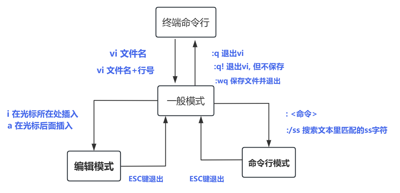 说明:在终端输入 vi 文件名打开文件,这时进入"一般模式"。在一般模式下,按 i或 a键进入"编辑模式",就可以打字修改内容了。在一般模式下,按 :键进入"命令行模式",可以执行保存、退出等命令。