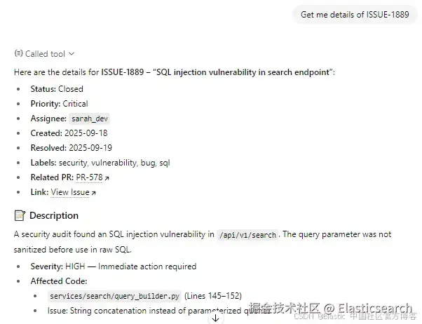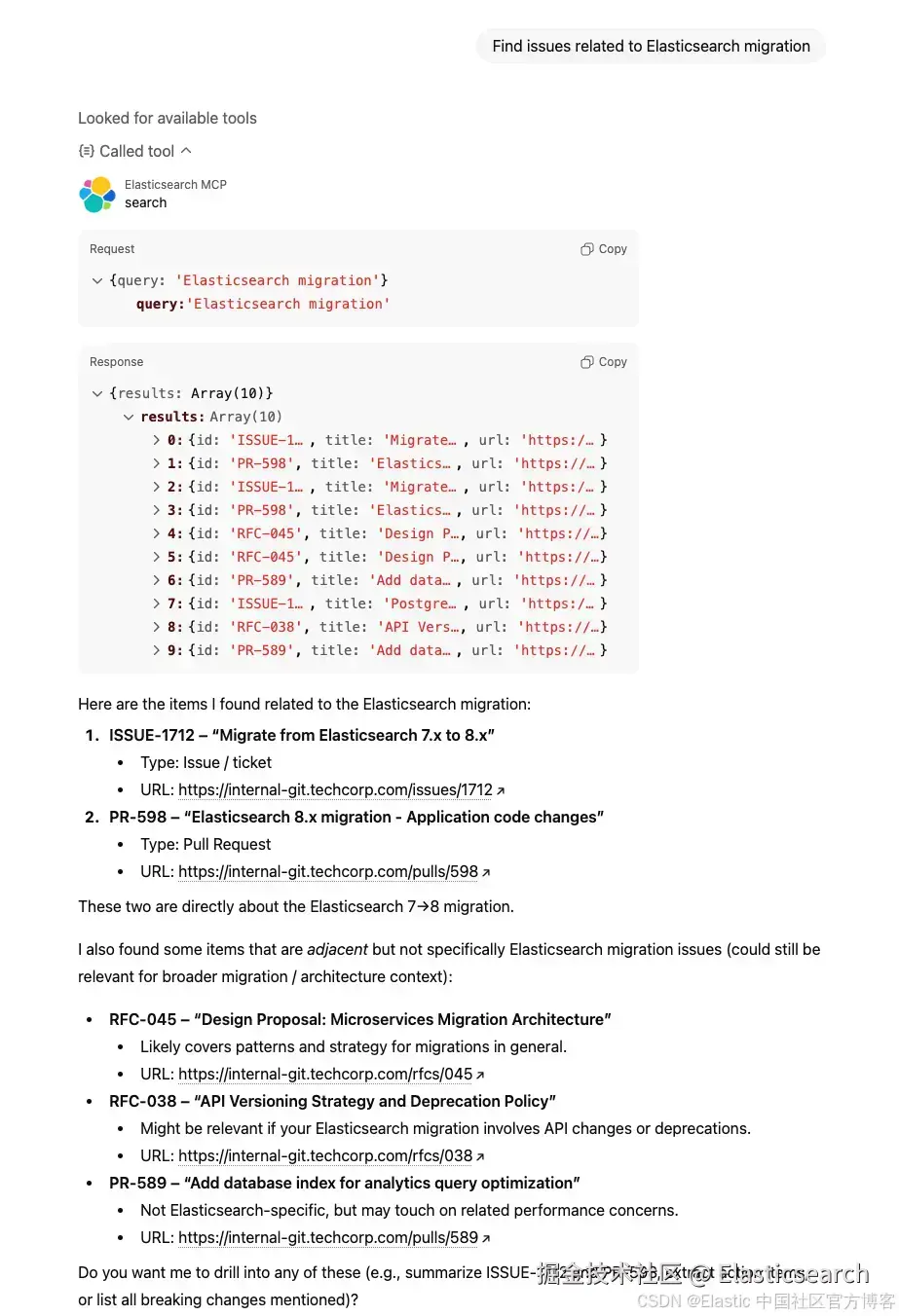 提问: "Find issues related to Elasticsearch migration" 并确认调用了 actions tool。
