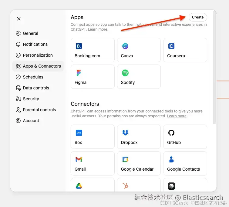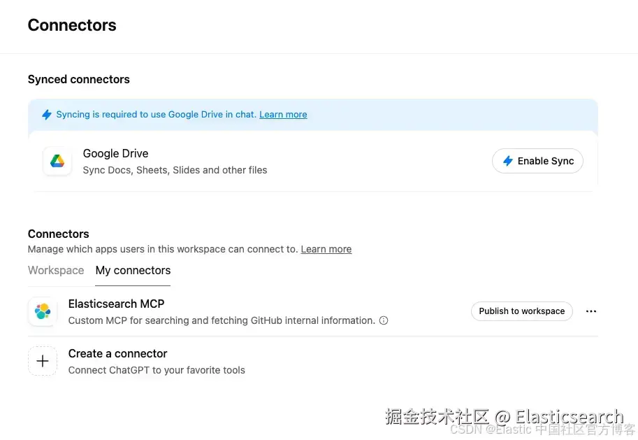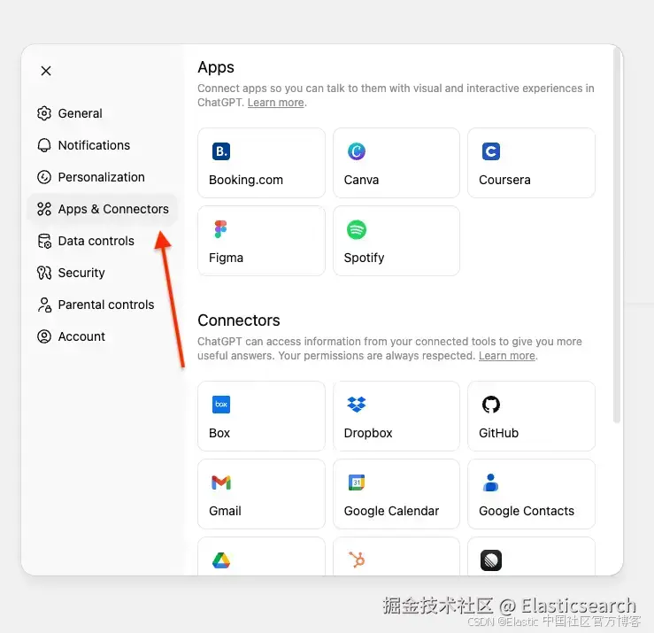 自定义 connectors 让你能够把现有的 ChatGPT connectors 与 Elasticsearch 等额外数据源结合,从而获得更完整的答案。