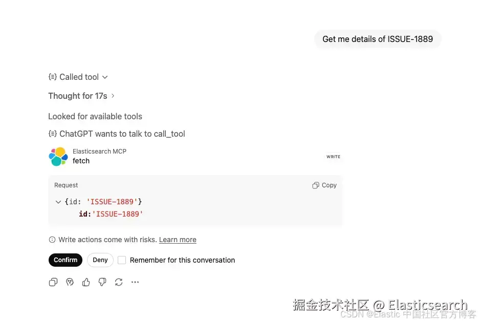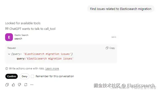 ChatGPT 会使用你的查询调用 search tool。你可以看到它正在查找可用工具,并准备调用 Elasticsearch tool,同时在对工具执行任何操作之前,会先向用户确认。