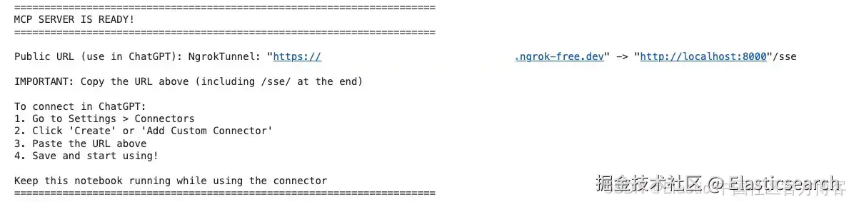如果你的服务器正在运行,连接会立即生效。无需额外身份验证,因为 Elasticsearch API key 已在服务器中配置。