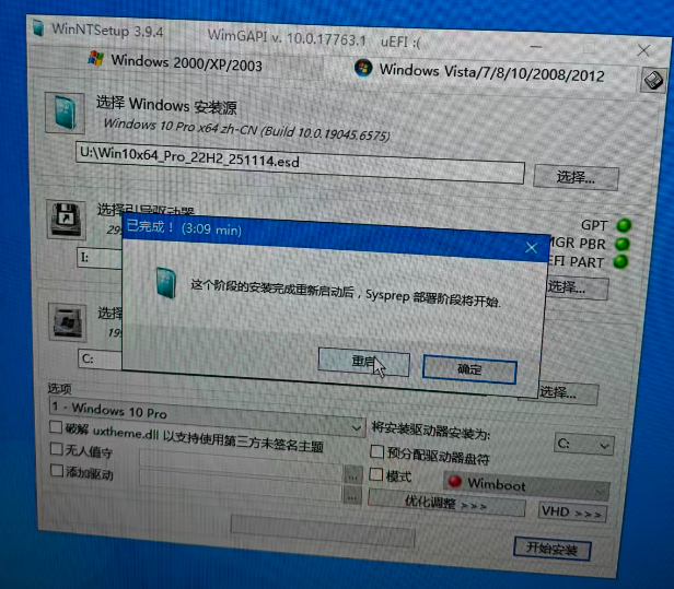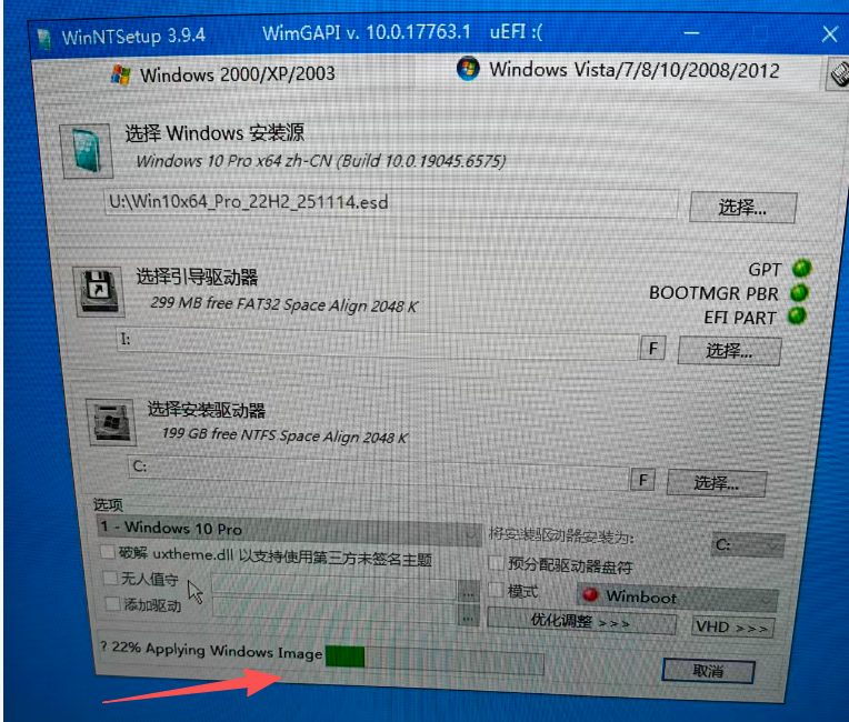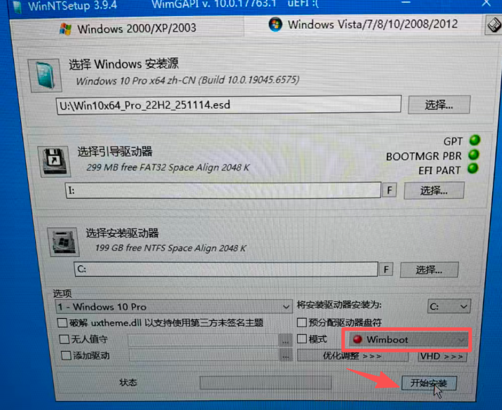 确保右下角模式选择的是Wimboot,点击开始安装