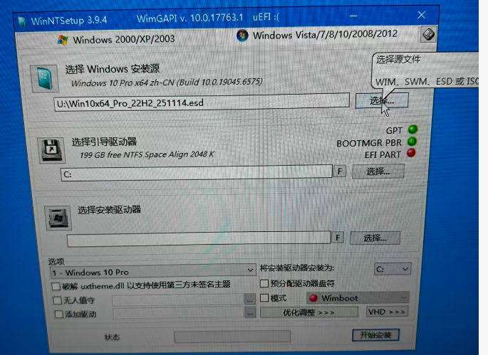- 选择Windows安装源:选择普通U盘中的.esd文件