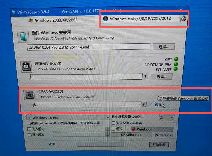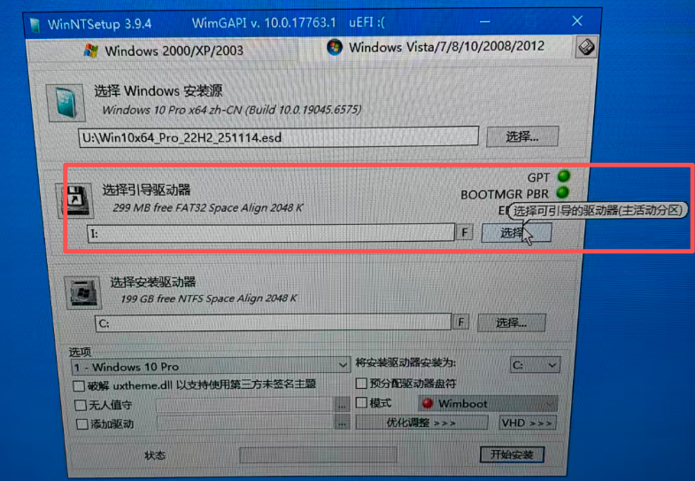 - 选择引导驱动器: 选择ESP步骤生成的I盘,即容量大小299MB的空白盘