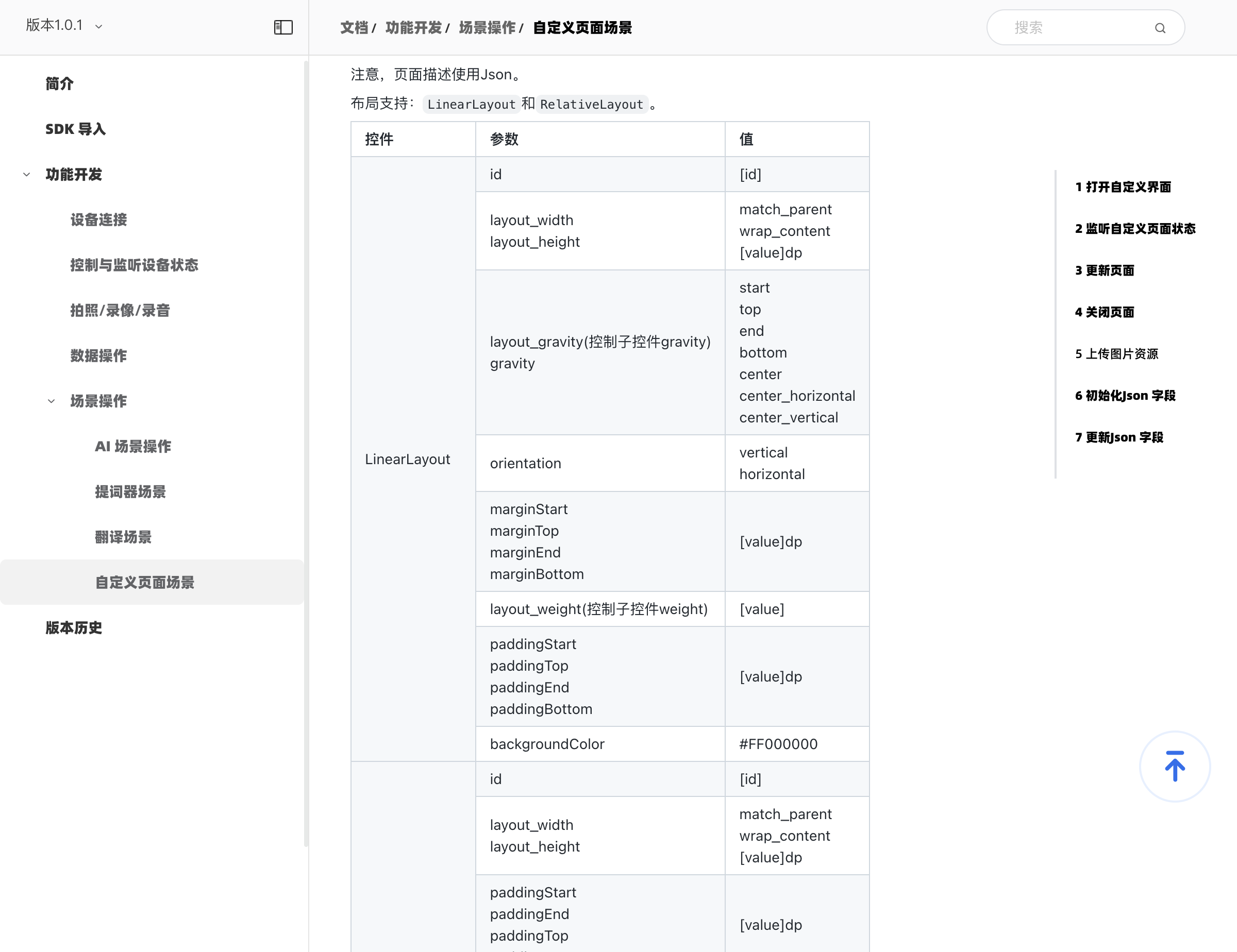 打开Rokid官方文档,找到"自定义页面场景"章节,里面详细介绍了JSON布局的使用方法: