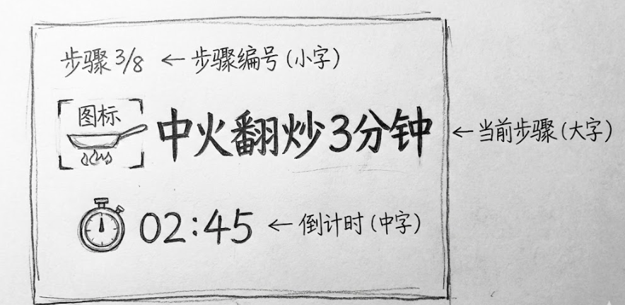 - 视觉提示:火候图标(小火/中火/大火)一目了然