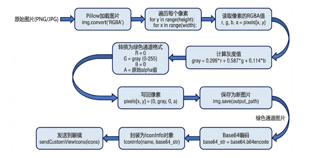 根据官方文档,图片只显示绿色通道。如果传普通PNG,眼镜上可能显示一片黑。必须按照文档要求转换为绿色通道格式。