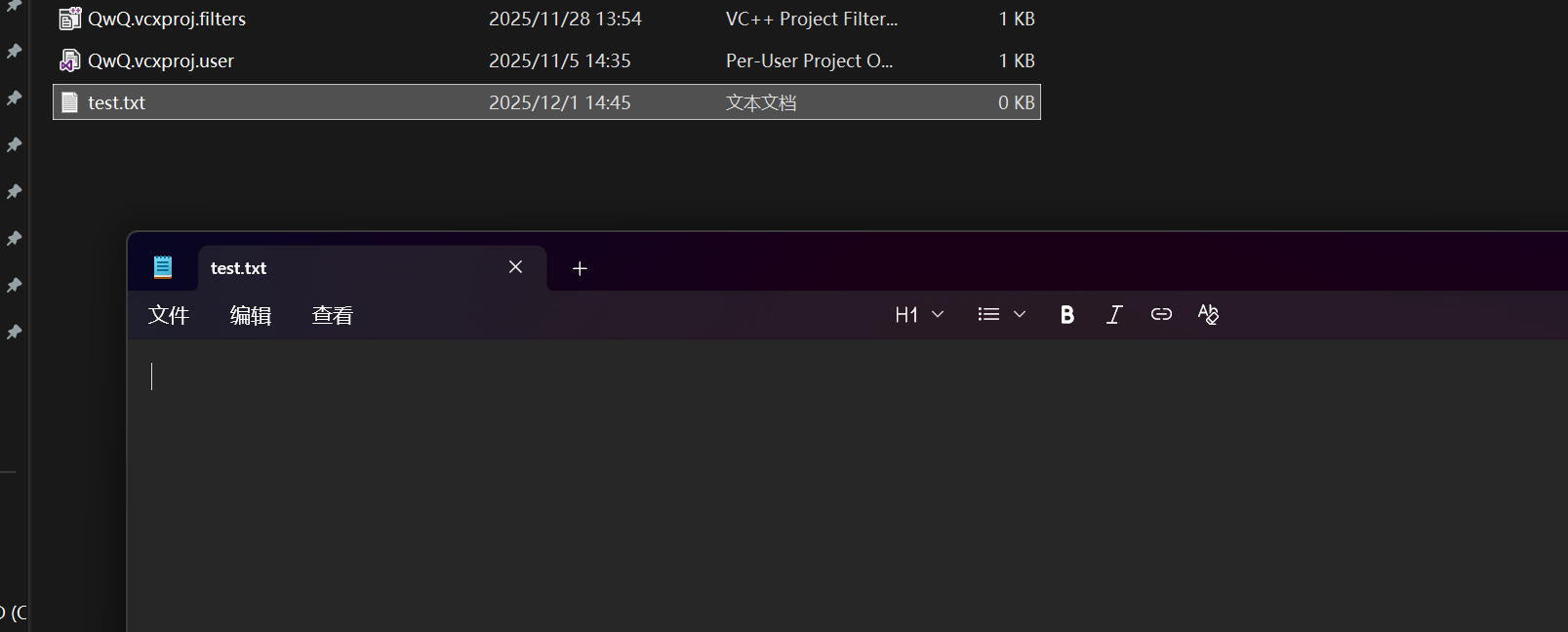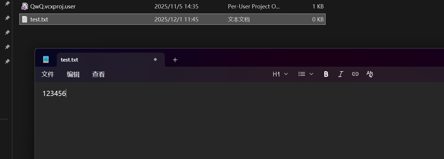 现在我们先在源文件旁新建一个文件,并输入一些内容