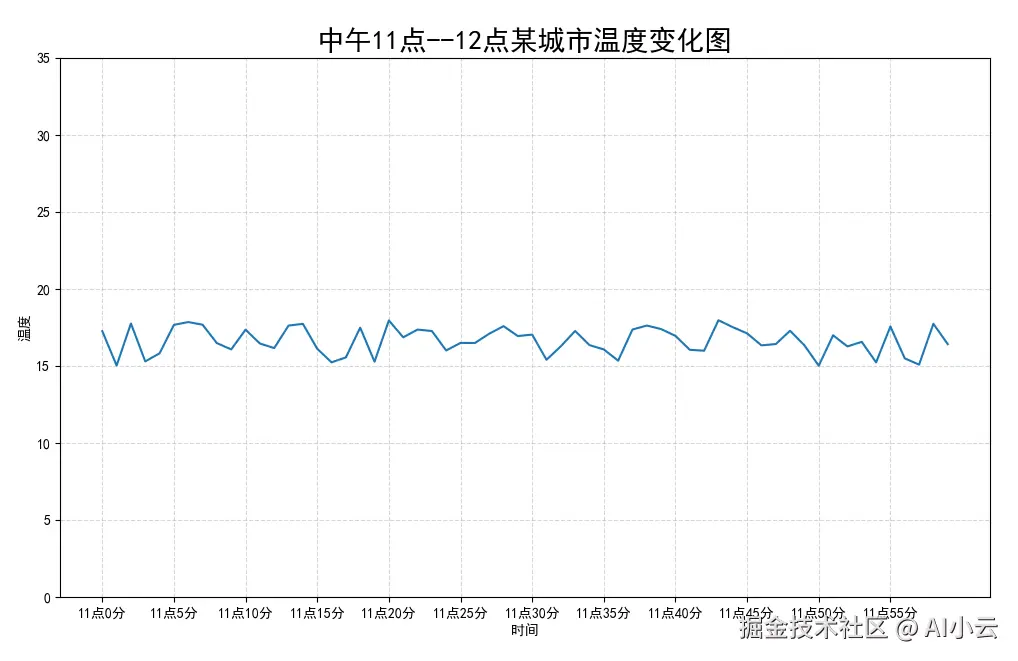 plt.title("中午11点--12点某城市温度变化图", fontsize=20)
