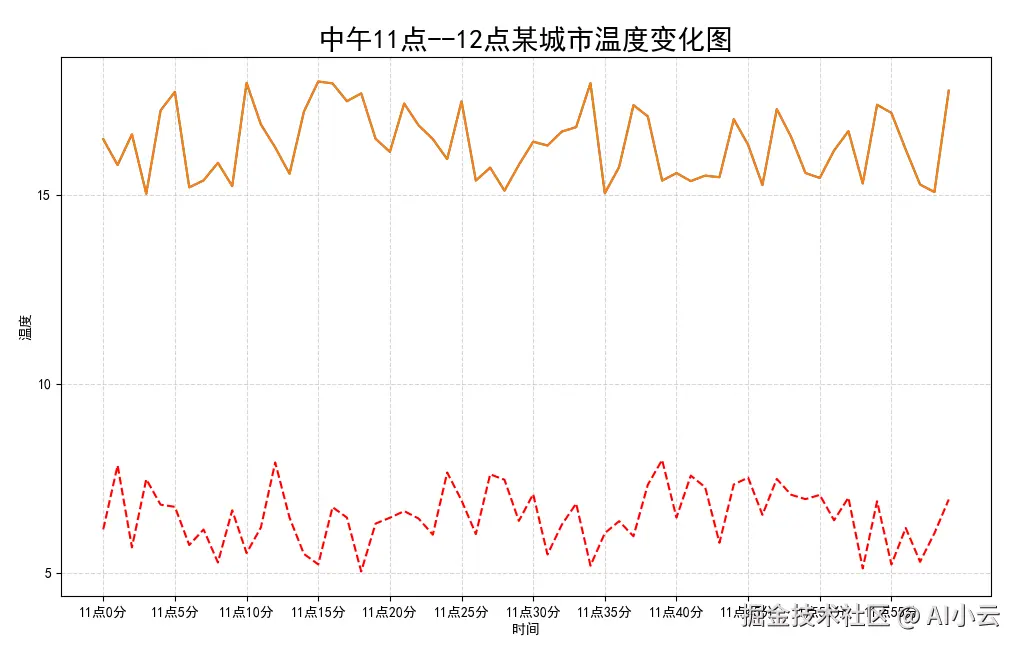 需求:再添加一个城市的温度变化。 收集到北京当天温度变化情况,温度在1度到3度。怎么去添加另一个在同一坐标系当中的不同图形,其实很简单只需要再次plot即可,但是需要区分线条,如下显示: