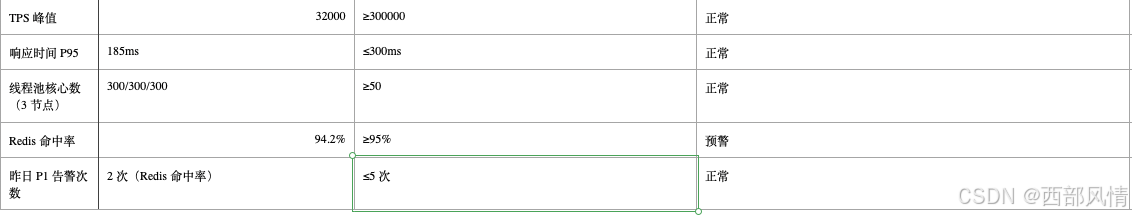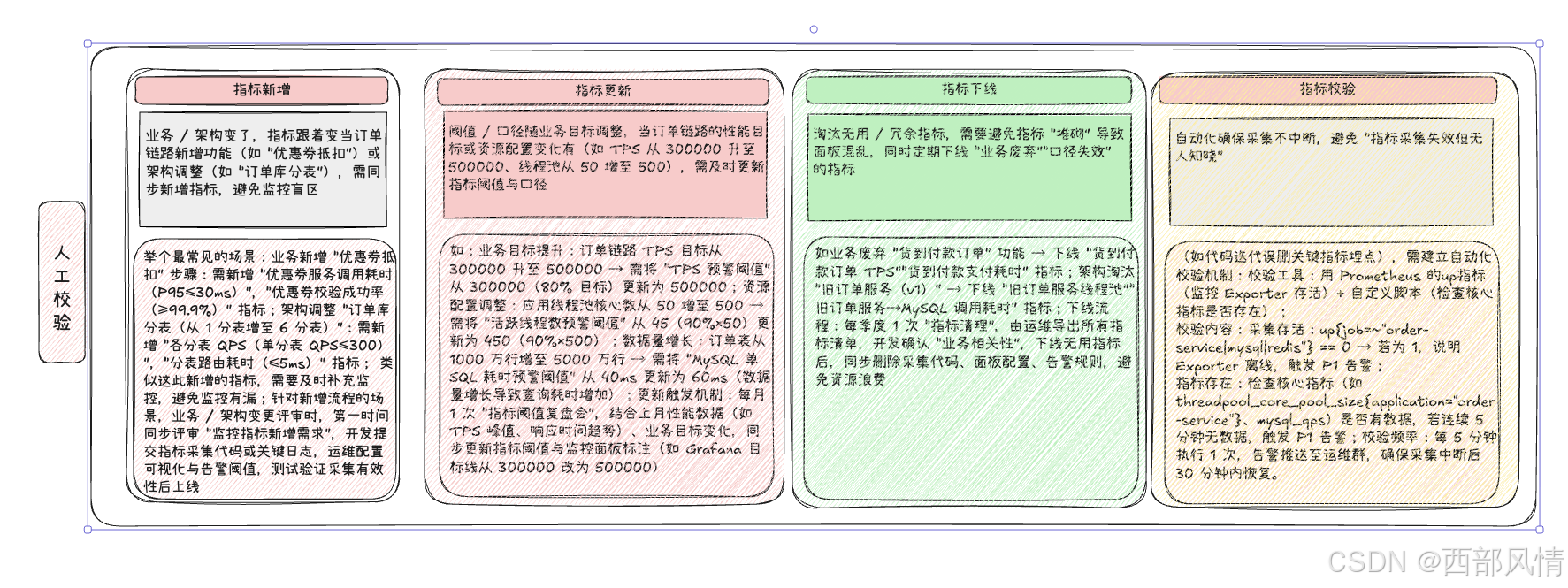 需要明确持续维护的核心目标不是『一次监控部署』,对监控无需盯大盘,常规作法通过告警感知,机制确保,这需要前置条件为指标有效性-指标采集不中断、口径不失效(如线程池核心数指标始终能反映真实配置,不因代码迭代丢失);,告警精准性-无 "告警风暴"(如重复告警、无效告警),无 "漏告警"(如响应时间超阈值但未触发通知);,问题可预见性-过历史数据发现 "隐性性能退化"(如响应时间从 150ms 逐月升至 180ms),而非等故障发生;优化联动性-看护数据能反哺性能建模与资源配置(如发现连接池 100 冗余,可优化至 80 降低资源浪费)等