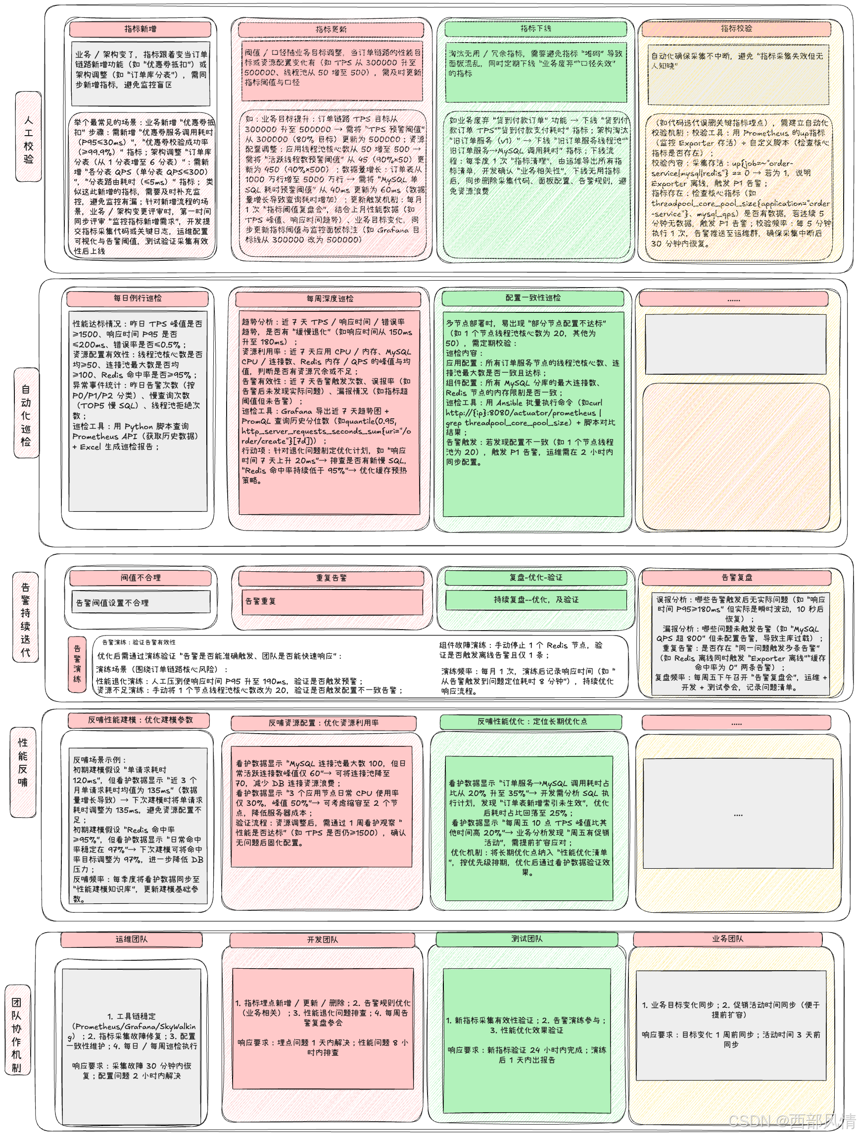 对订单创建链路而言,通过持续看护,能确保 "TPS≥1500、响应时间≤200ms" 的目标长期达标,同时让 "线程池≥50、连接池≥100" 的配置始终有效,最终实现 "性能稳定、资源可控、问题可预见" 的长期保障。