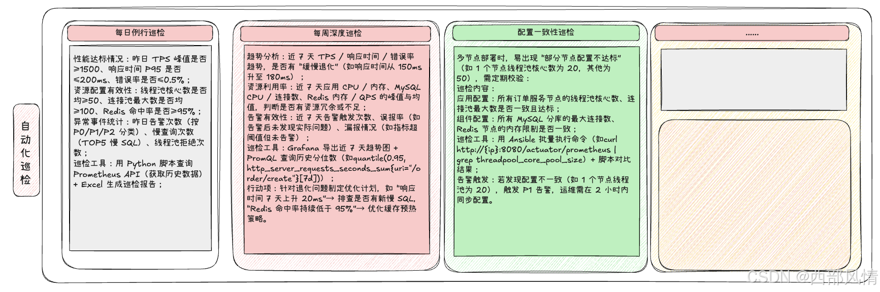 使用自动化机制替代人力(人工每天盯面板易遗漏问题,需通过 "脚本 + 工具" 实现自动化巡检,聚焦 "核心指标趋势、异常波动、配置一致性":),提升效率