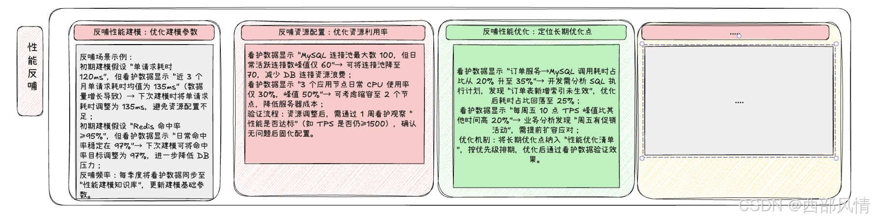 为作性能工程的前置介入,性能建模分析推导完成后,可观性平台搭建完成后,针对后续的业务迭代对性能的影响,以新项目的架构设计是否符合性能诉求,需要不断的持续维护和优化,这个过程基本上与迭代的生产周期保持同步,甚至是一个长期的系统工程:不断优化,不断适配的过程。