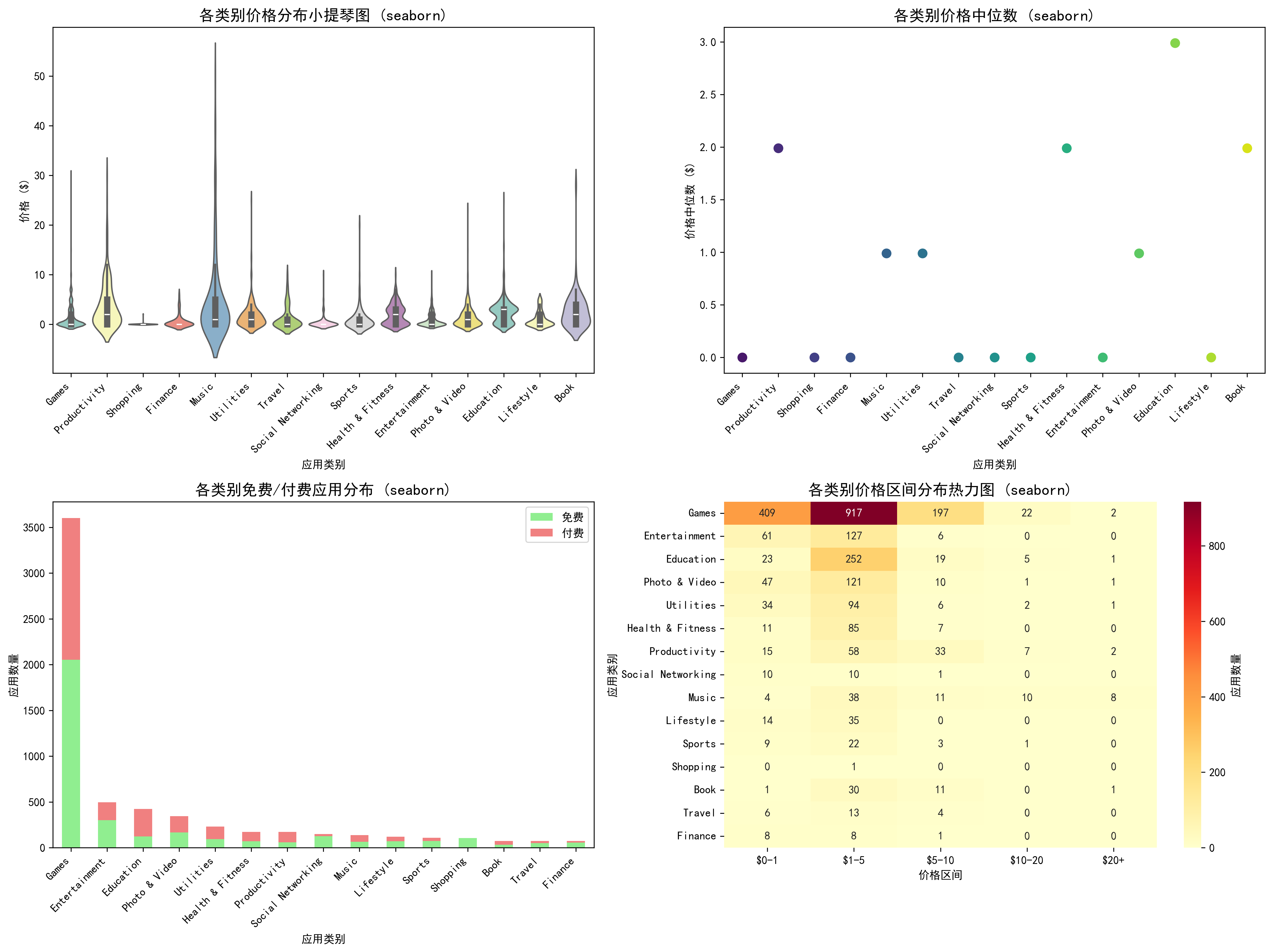 图4通过热力图清晰展示了各价格区间在不同类别中的分布情况。小提琴图则生动呈现了各类别价格分布的密度特征,部分类别呈现出双峰或多峰分布,反映了该类应用可能存在不同的定价策略细分。