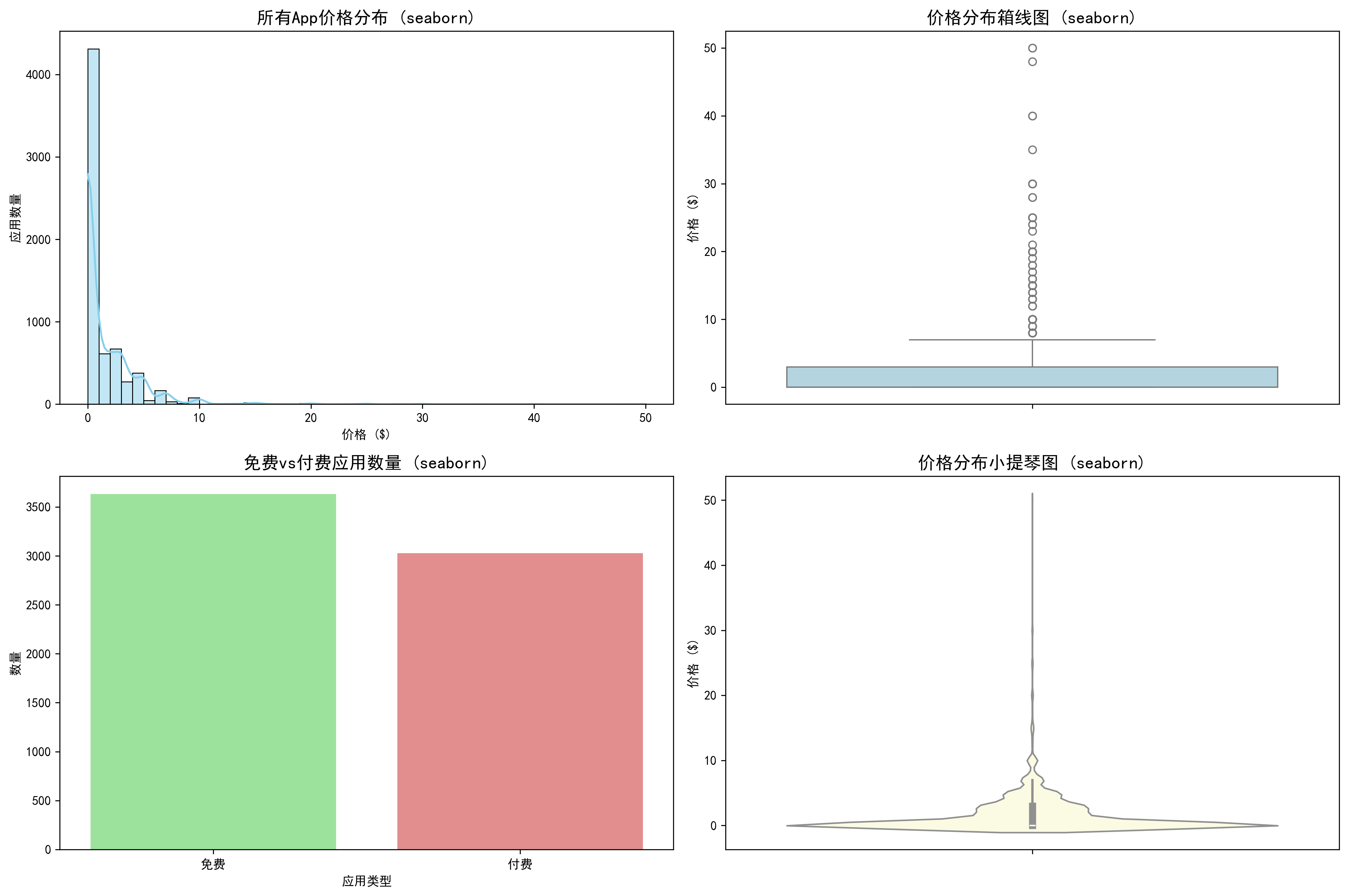 这些分析结果为应用开发者提供了有价值的市场参考,有助于制定更合理的产品定位、定价策略和用户体验优化方向。通过matplotlib和seaborn两个可视化库的结合使用,我们不仅能够从多个角度深入分析数据特征,还能够以专业美观的方式呈现分析结果,为决策提供有力支持。