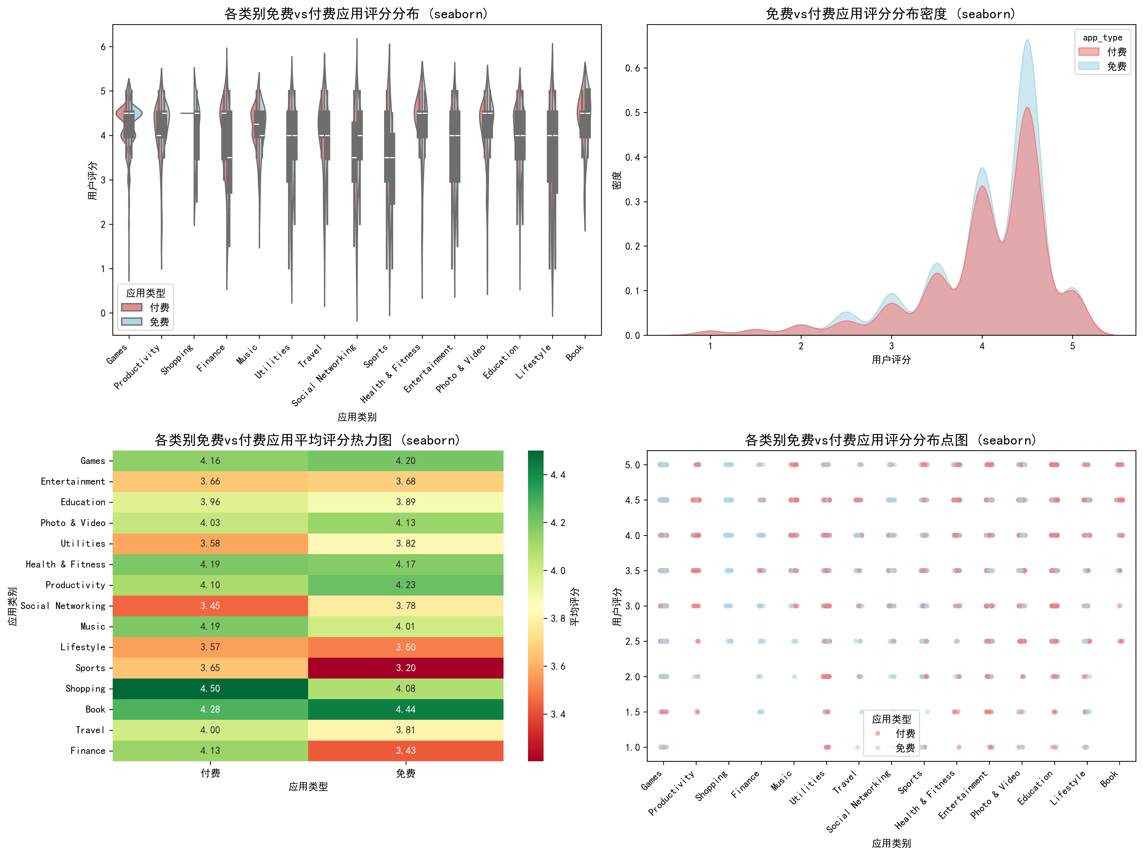 图6通过分裂小提琴图直观展示了免费与付费应用在各类别中的评分分布差异。密度曲线图显示两类应用的评分分布形状相似,但付费应用的评分分布略向左偏移。热力图则从另一个角度呈现了各类别中免费与付费应用的平均评分对比。