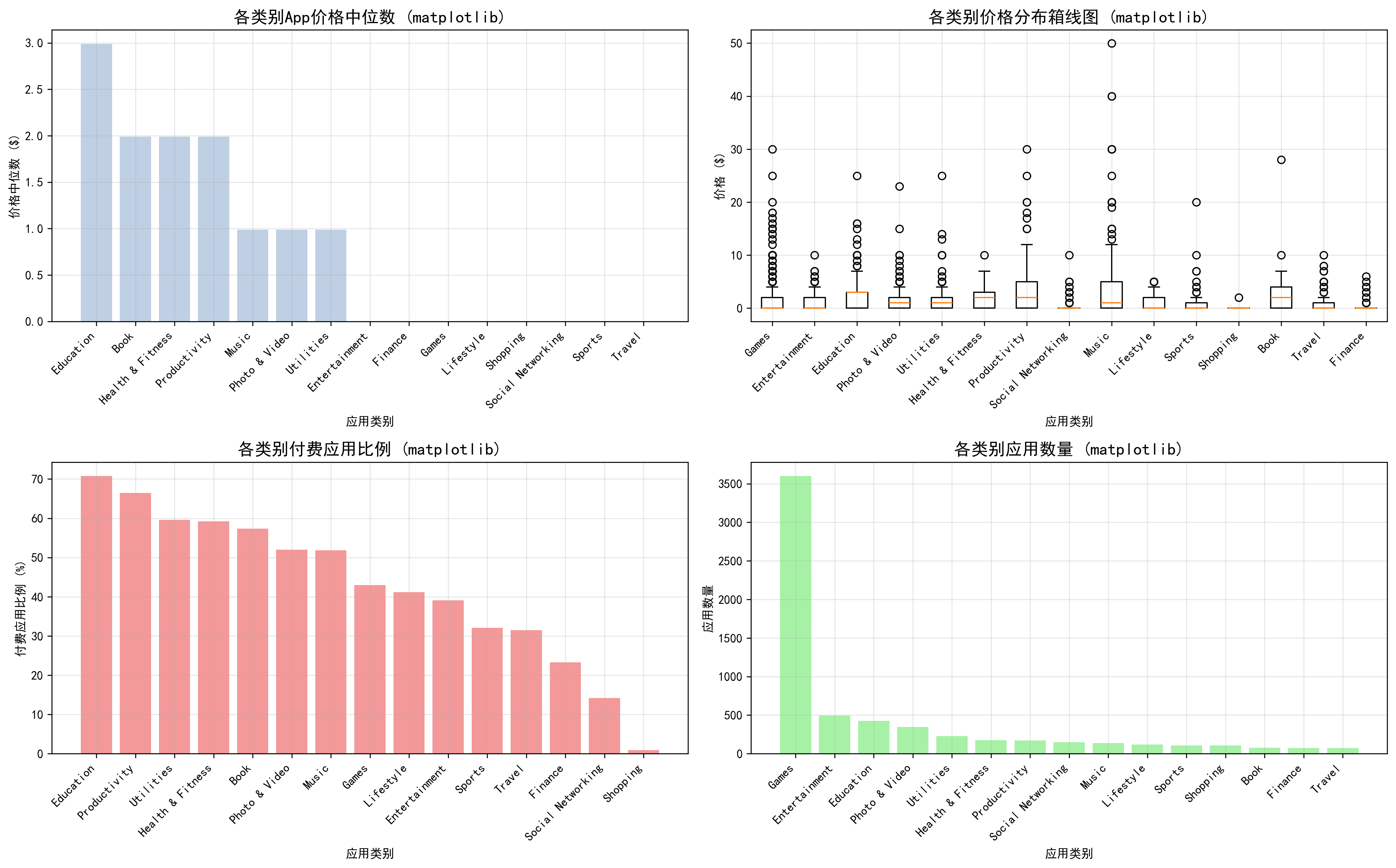 图5通过分组条形图清晰展示了各类别中免费与付费应用的评分差异。从评分中位数差异条形图可以看出,在某些类别中付费应用评分高于免费应用(绿色柱),而在另一些类别中情况相反(红色柱)。箱线图组合则全面展示了评分分布的集中趋势和离散程度。