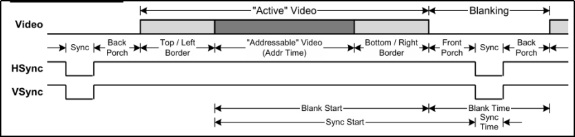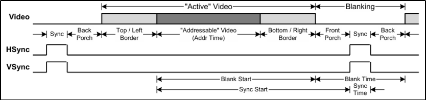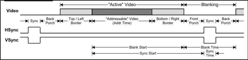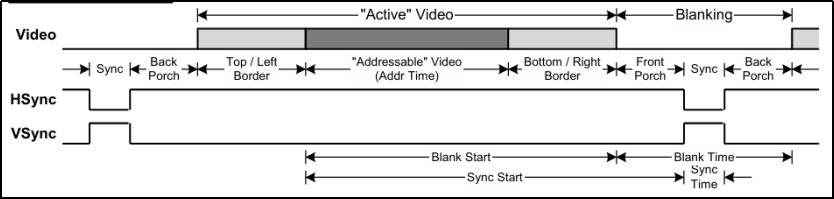 Addressable video: 位于中间的区域就是我们通常称为的可显示图像区域,也就是分辨率实际描述的区域。这是屏幕上实际用于显示图像内容的部分。
