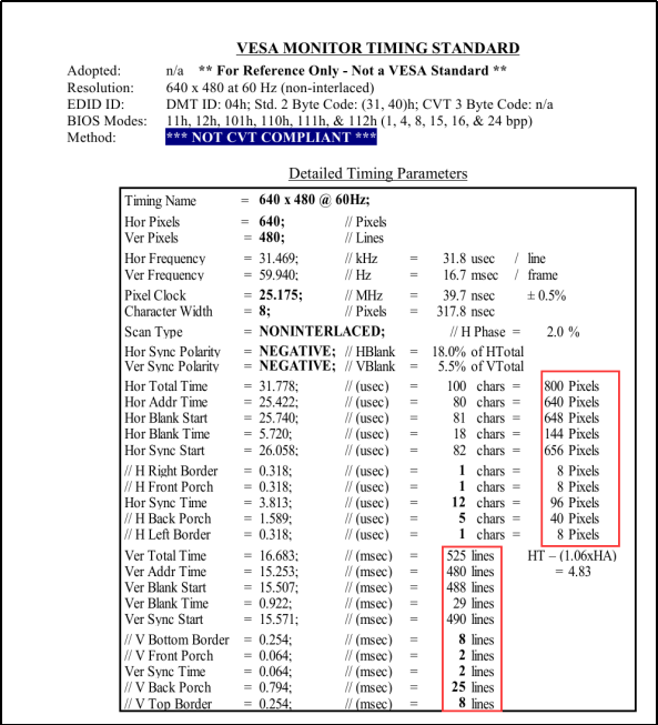 不同分辨率的时序参数各不相同。我们可以通过查阅DMT 文档(下载地址https://vesa.org/vesa-standards/)来获取这些信息。这里以640*480@60为例教大家如何查看相关参数。