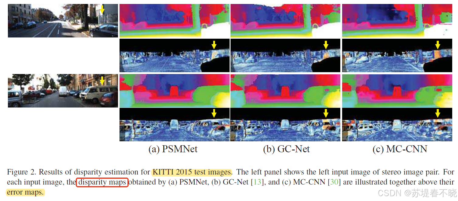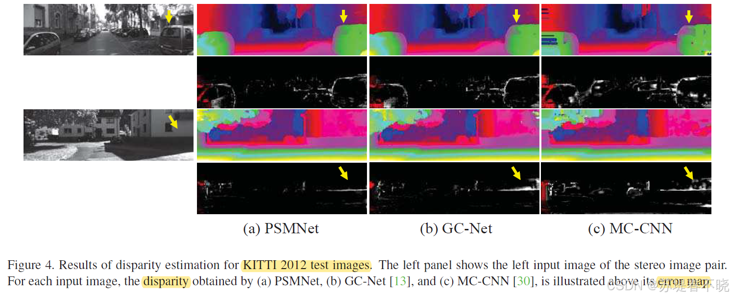 黄色箭头所指区域作者的方法优势明显,第二行和第四行是 error maps,越红表示误差越大