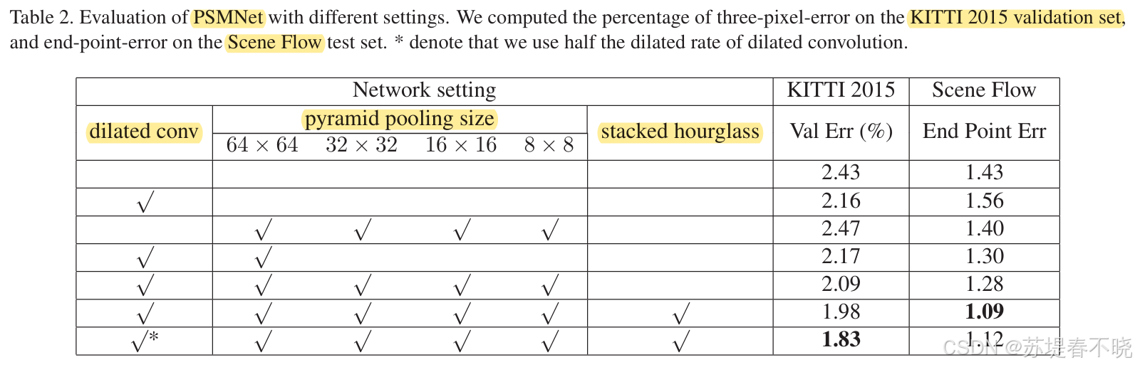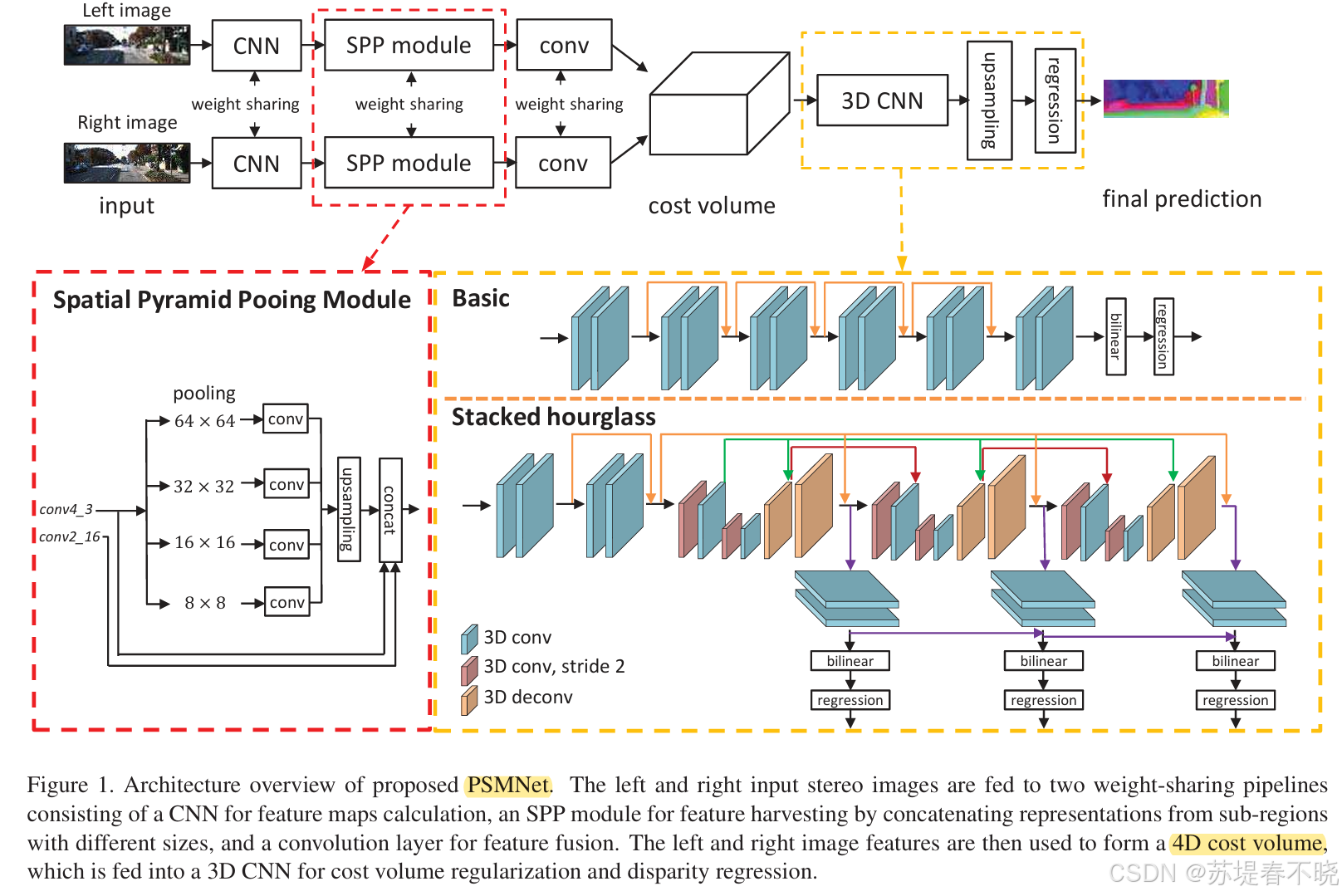 - 提出了 end-to-end learning framework(PSMNet ) for stereo matching ,用 Spatial pyramid pooling(SPP ) 提取 global context information,用 stacked hourglass 3D CNN 去 regularize the cost volume(也强化了 global context information)